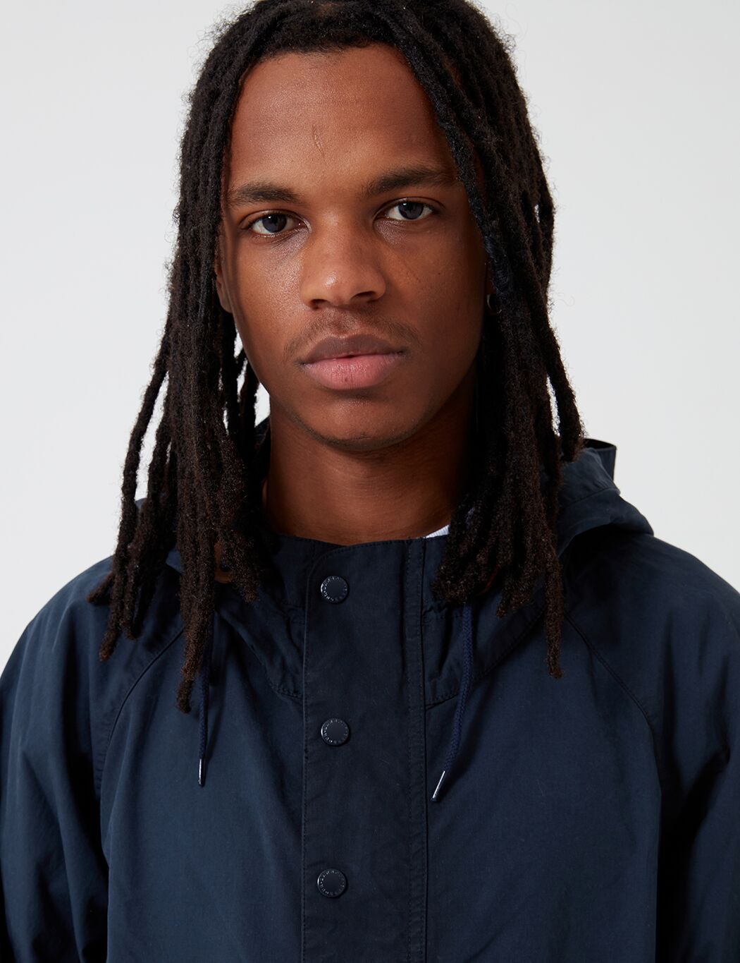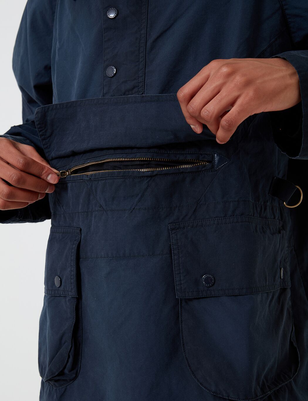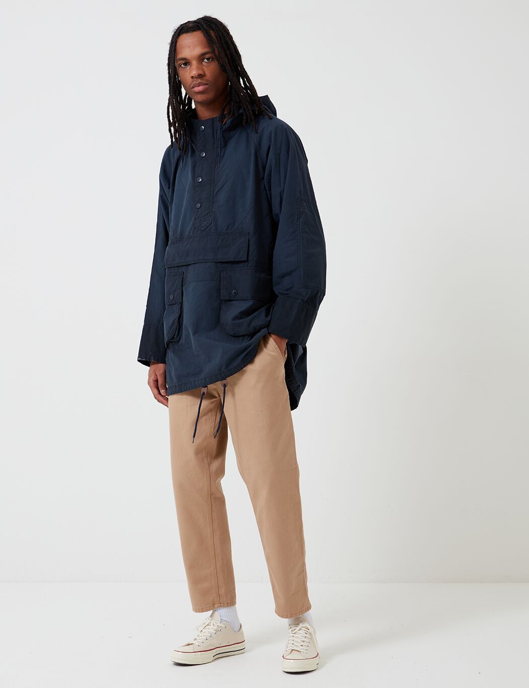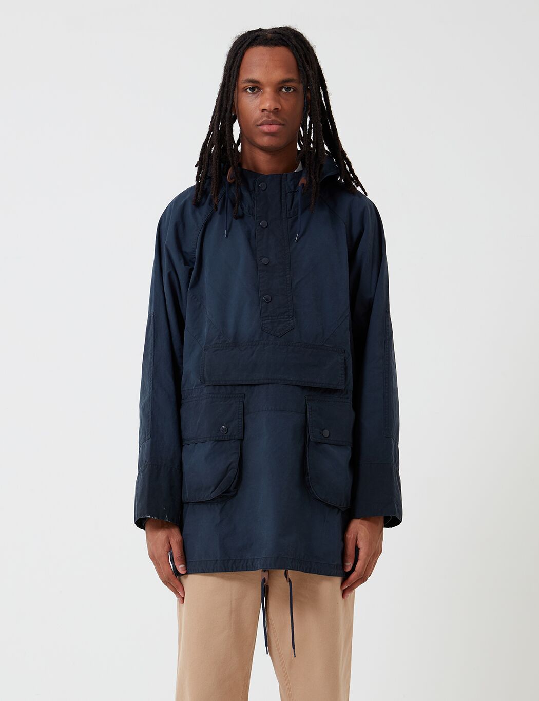 The Engineered Garments x Barbour Warby jacket in navy blue. Inspired by the Longshoreman smock, the Warby is reimagined this season in a washed 6oz waxed cotton for a uniquely aged finish. Cut to a shorter, more contemporary fit than the original.