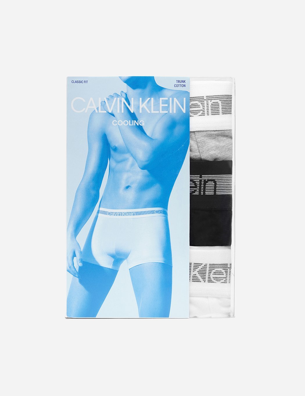 The Calvin Klein 'Cooling' three pack boxer shorts in grey heather, black and white colours from the Calvin Klein Underwear Spring Summer 2019 collection.