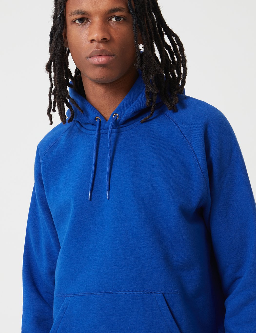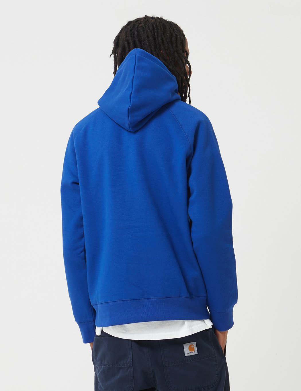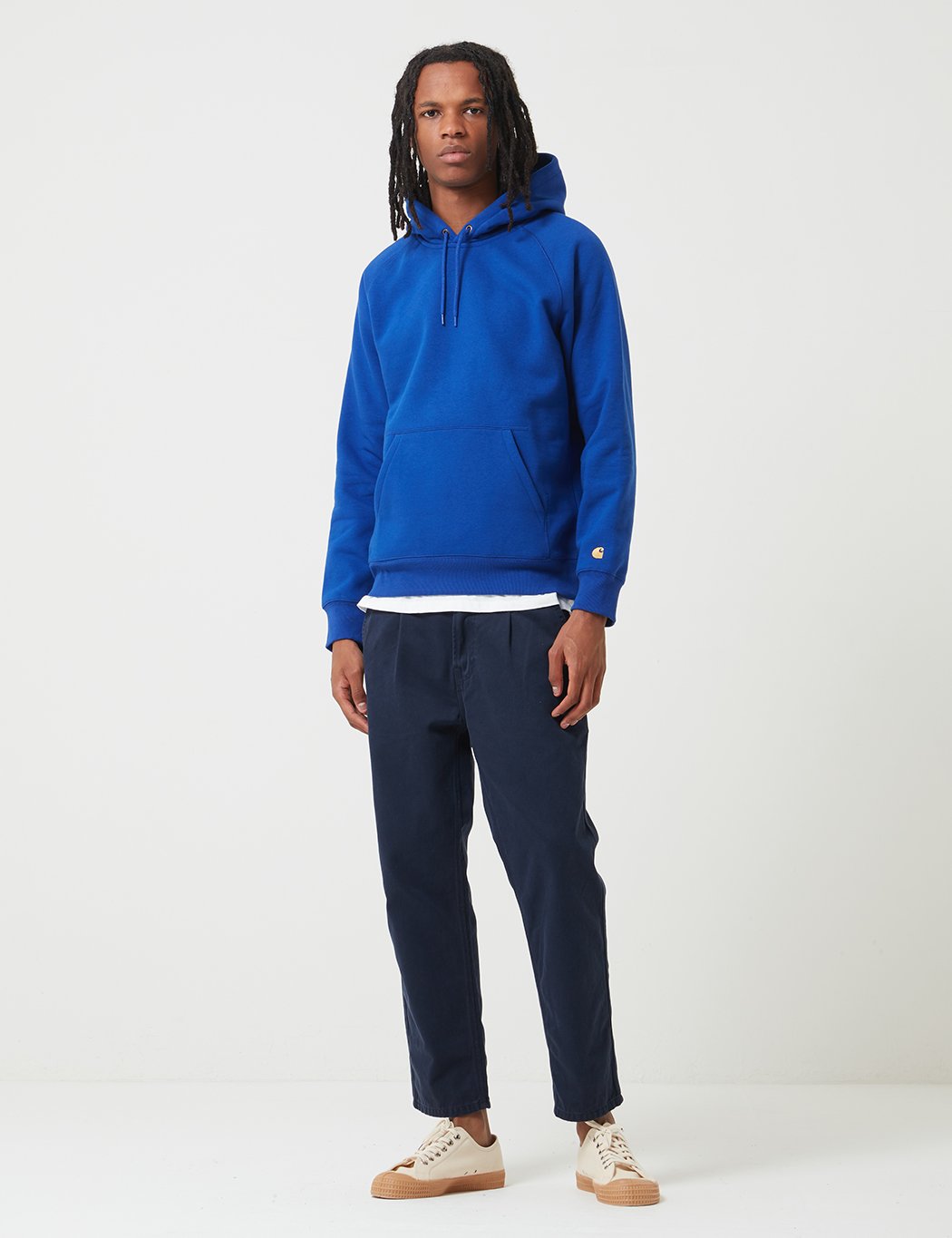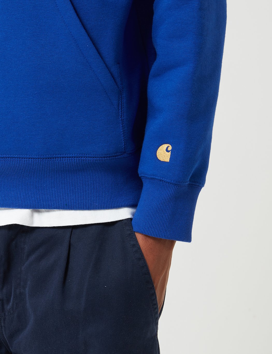 The Carhartt Work In Progress Chase Hooded Sweatshirt in Thunder Blue with Gold embroidery from the Carhartt Chase sweatshirt range.