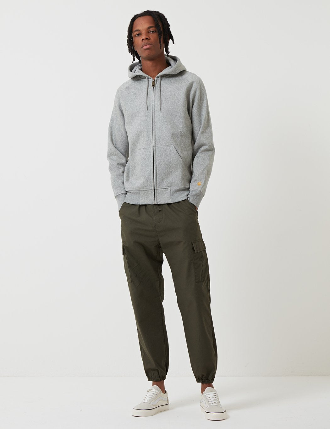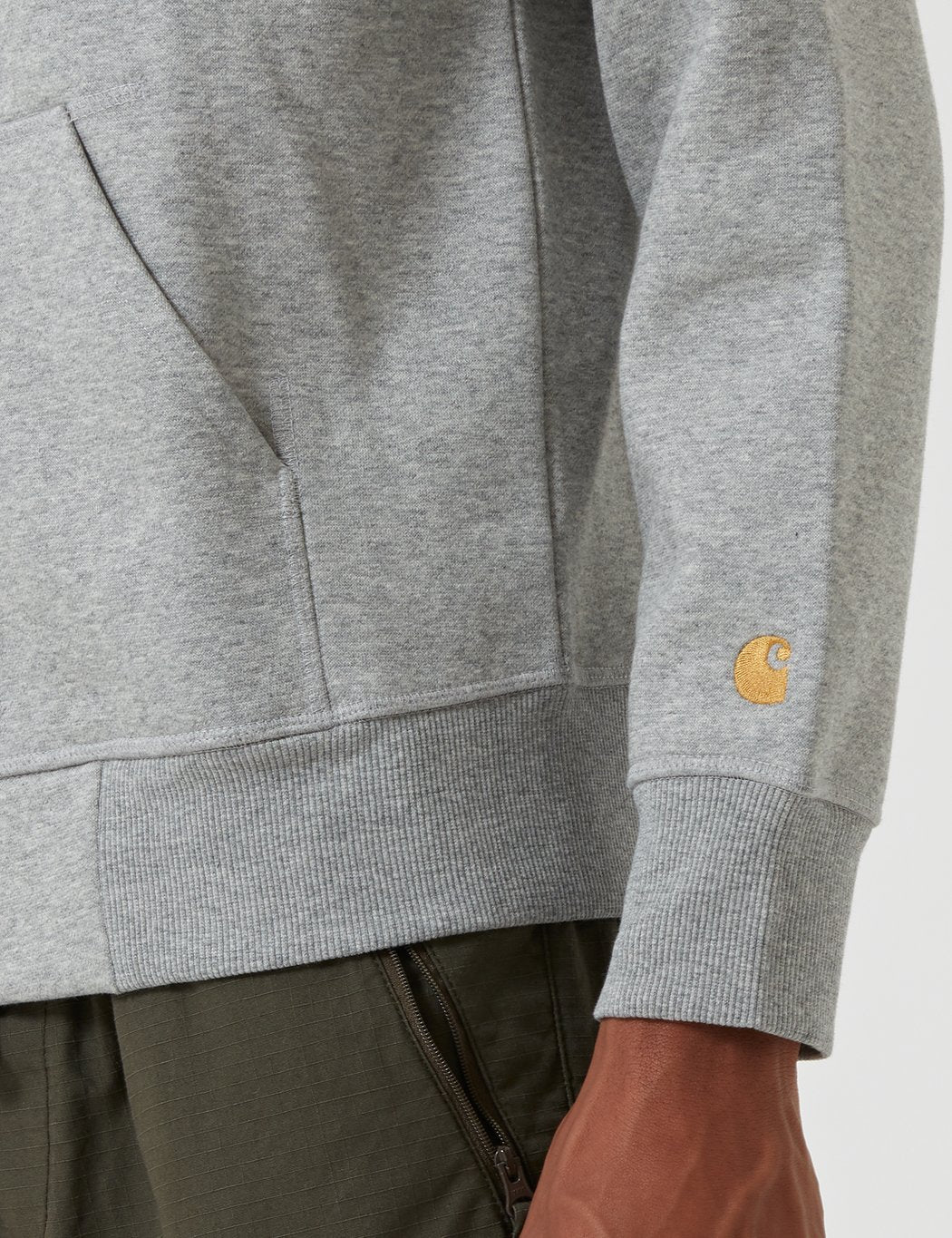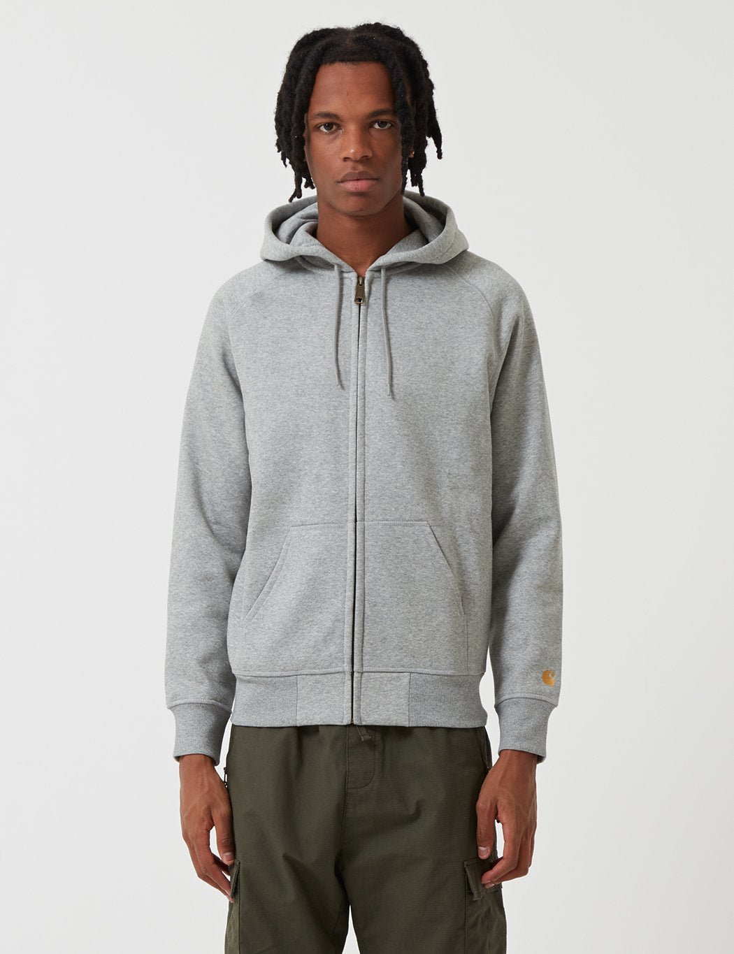 The Carhartt Chase hooded sweatshirt zip jacket in Grey Heather with Gold embroidery from the Carhartt Chase sweatshirts collection.