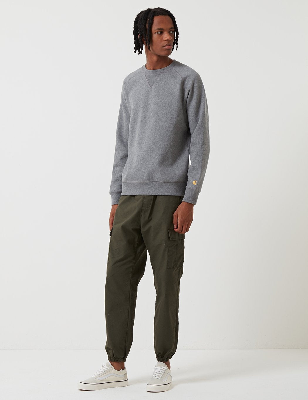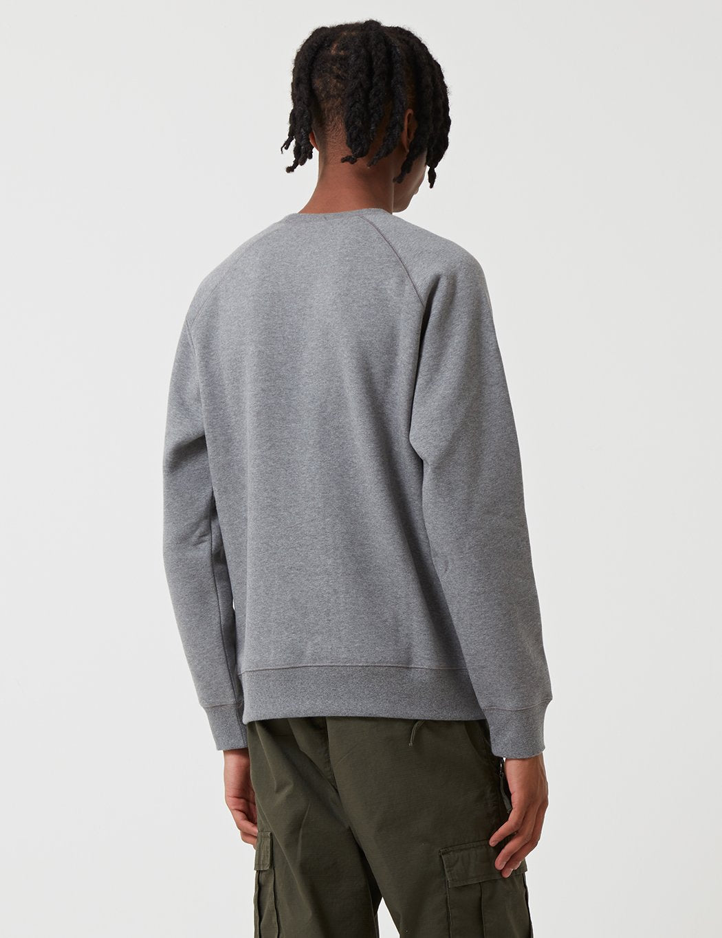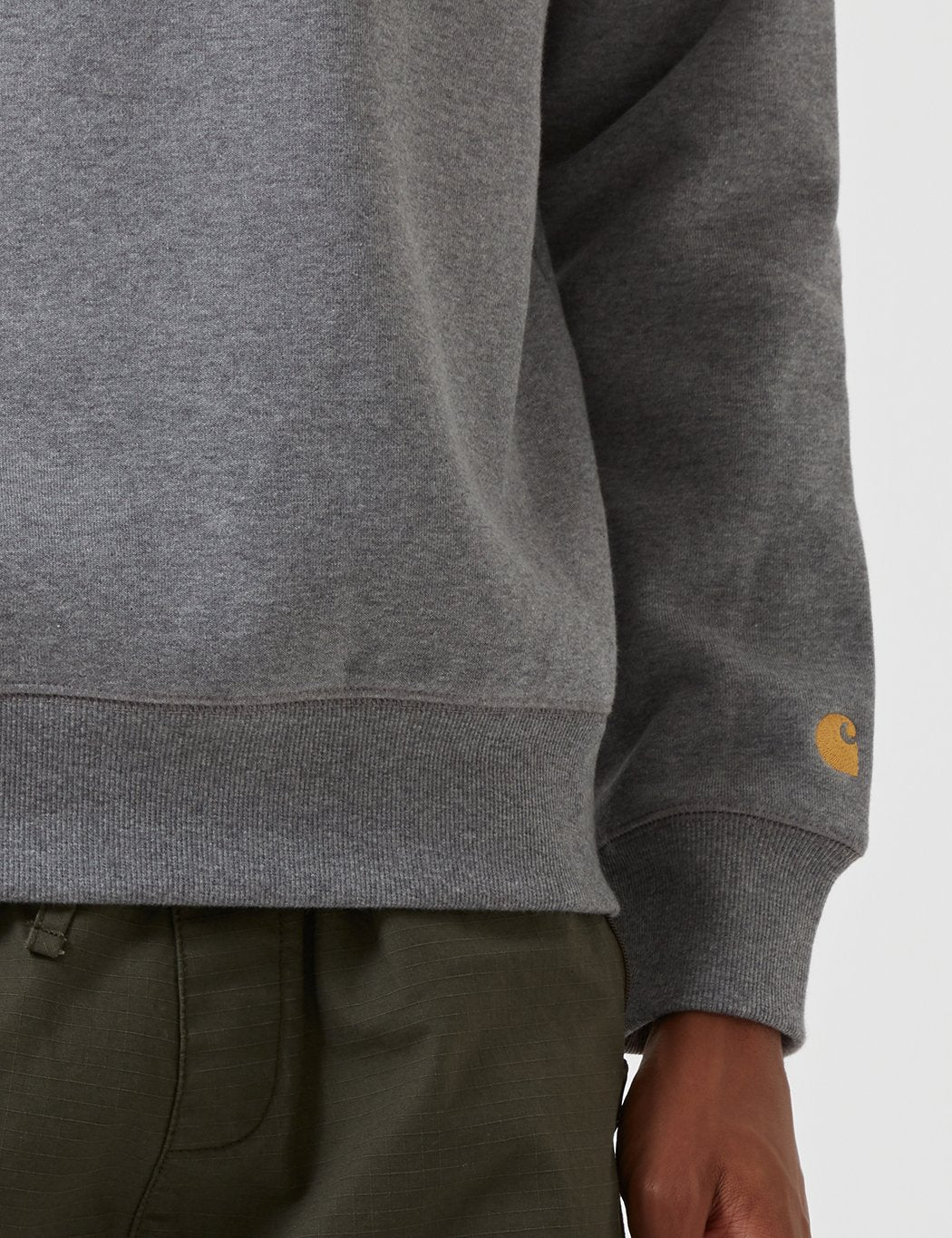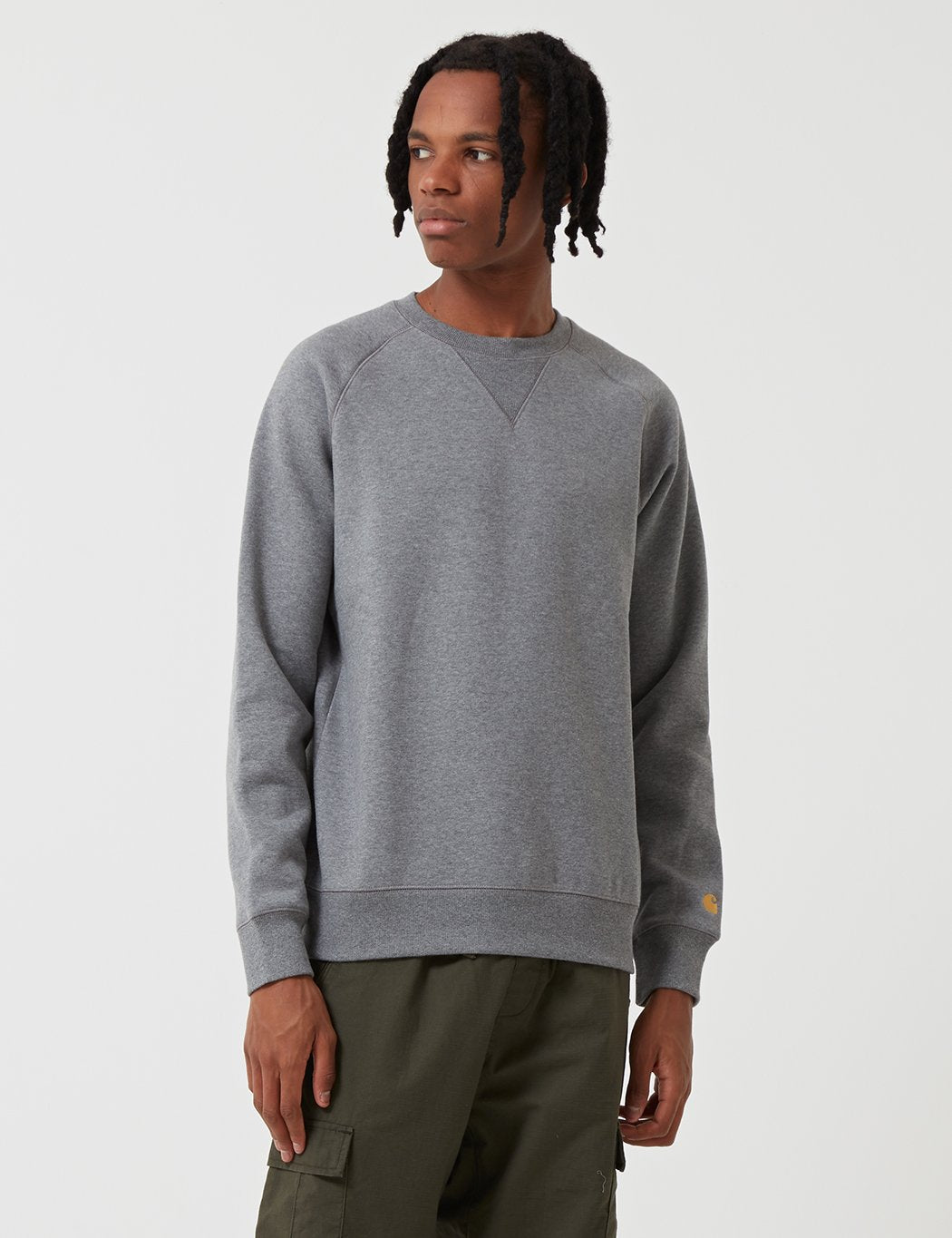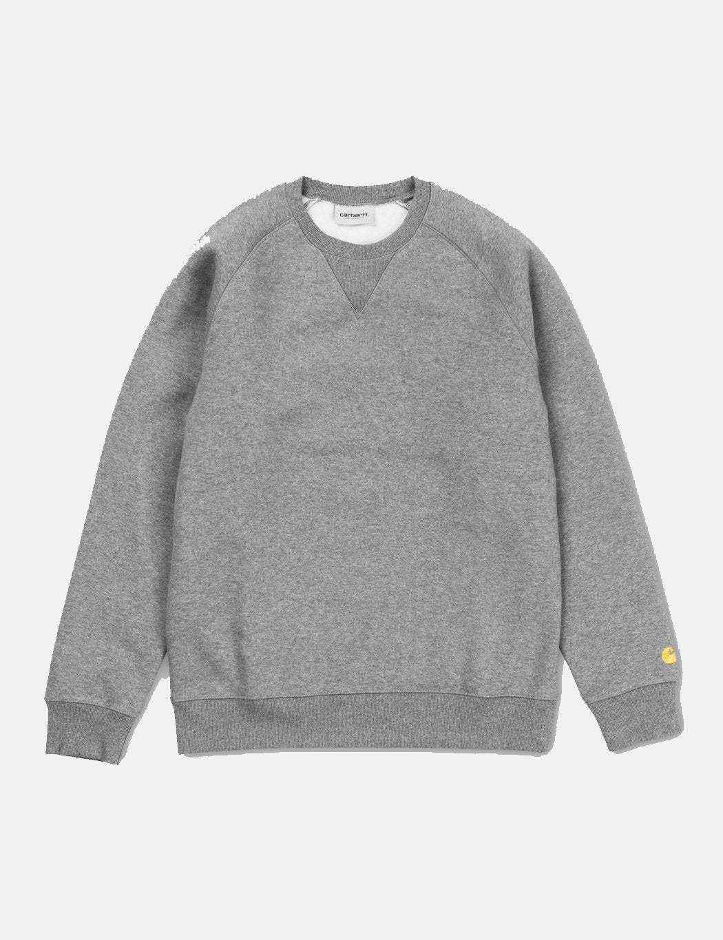 The Carhartt Chase sweatshirt in Dark Grey Heather with Gold embroidery from the Carhartt Chase sweat program.