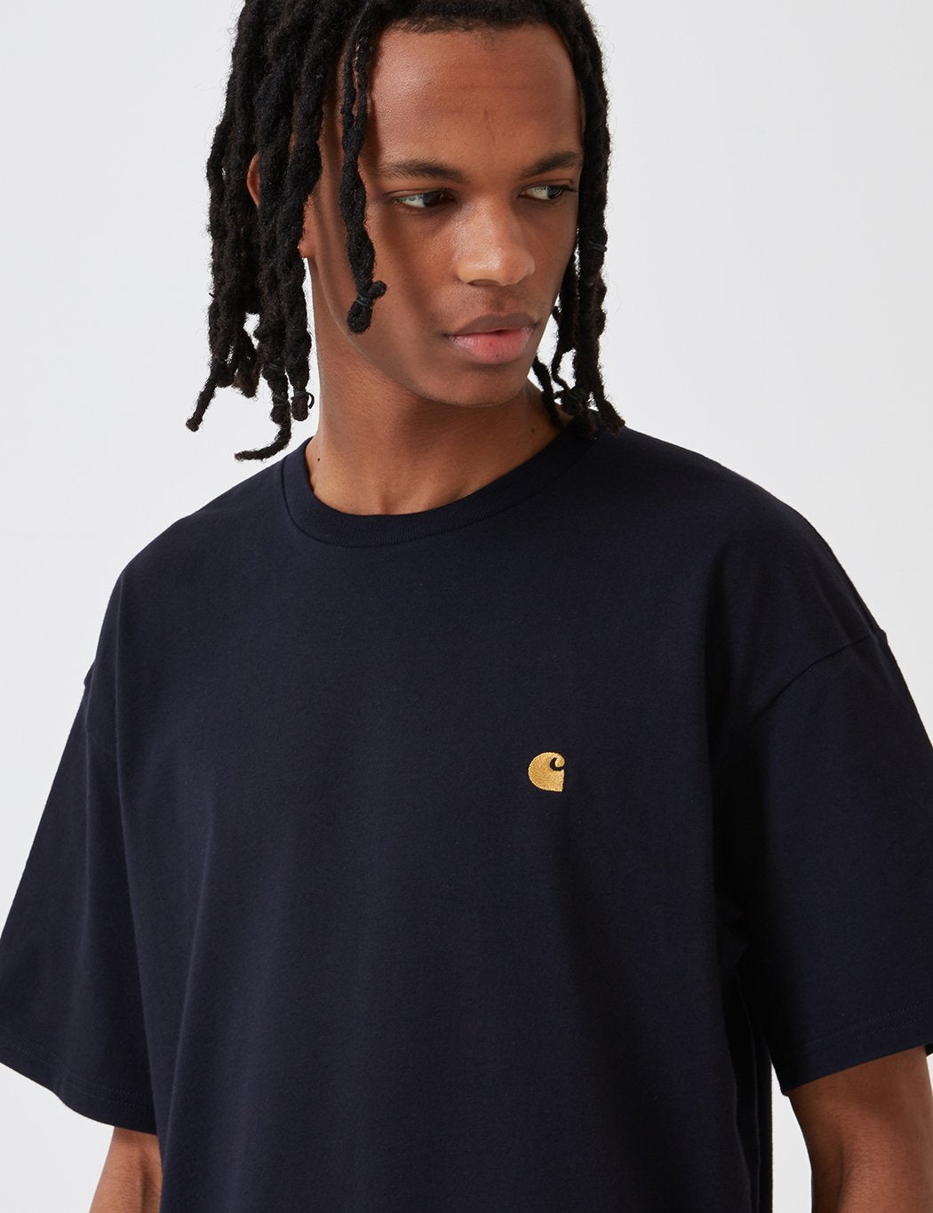 The Carhartt Work In Progress Chase t-shirt dark navy blue with gold embroidery from the Carhartt Spring/Summer 2020 Chase collection.