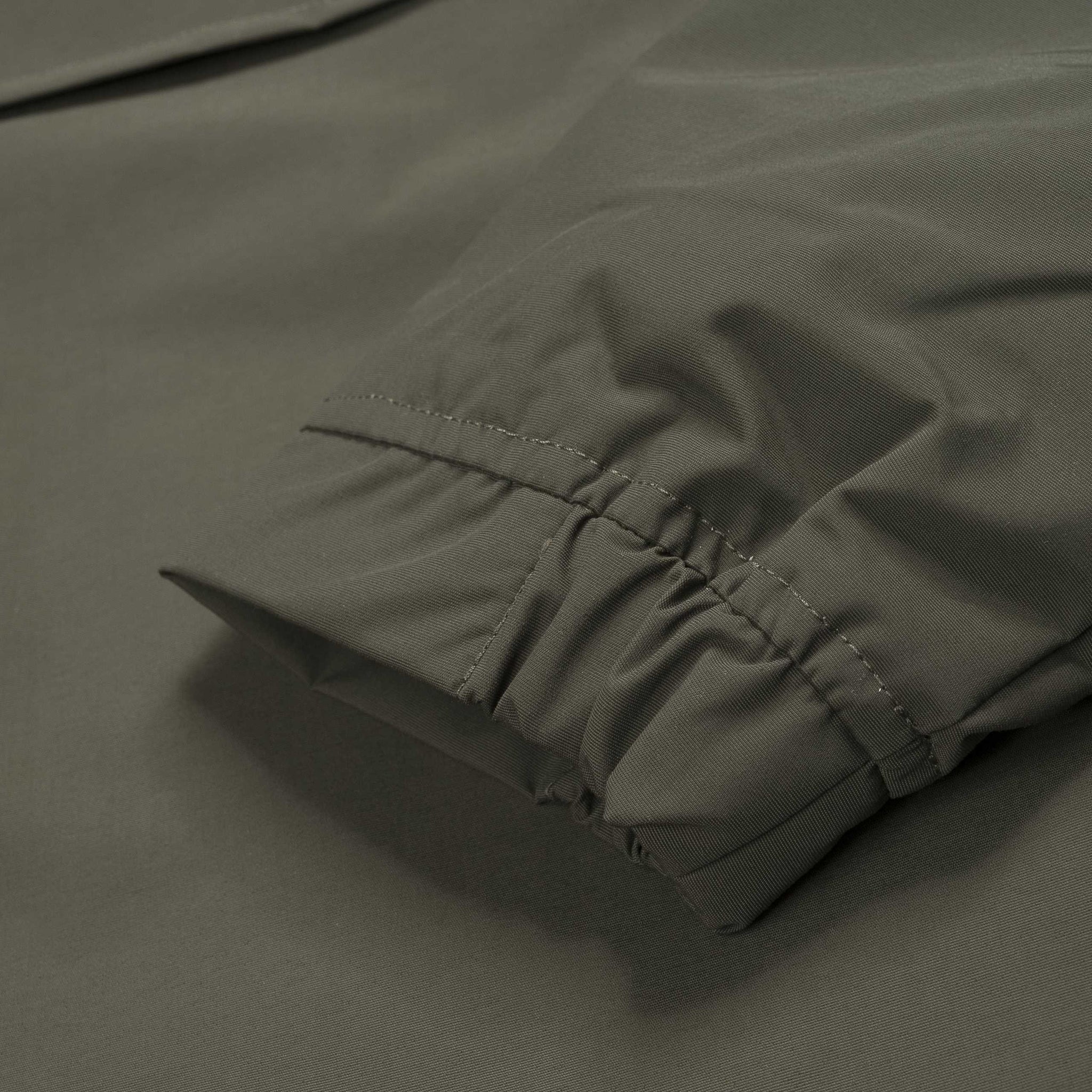 The Nimbus Pullover is in a water repellent teflon and milky coated fabric. It features adjustable hood and bottom band, pocket with hidden zip, side opening with zip and square label.