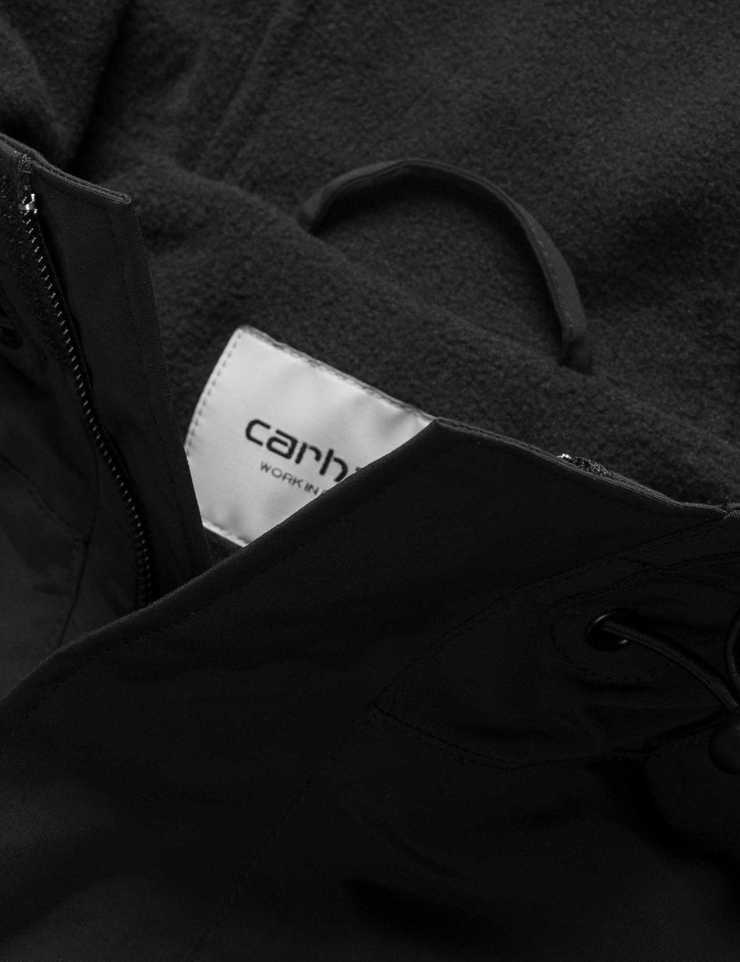 The Nimbus Pullover Jacket in Black from the Carhartt WIP Jackets Fall/Winter 2019 collection. This signature apparel from the Carhartt WIP collection is lined with warm fleece and has an adjustable hood making it suitable for all weather, especially through Fall and Winter.