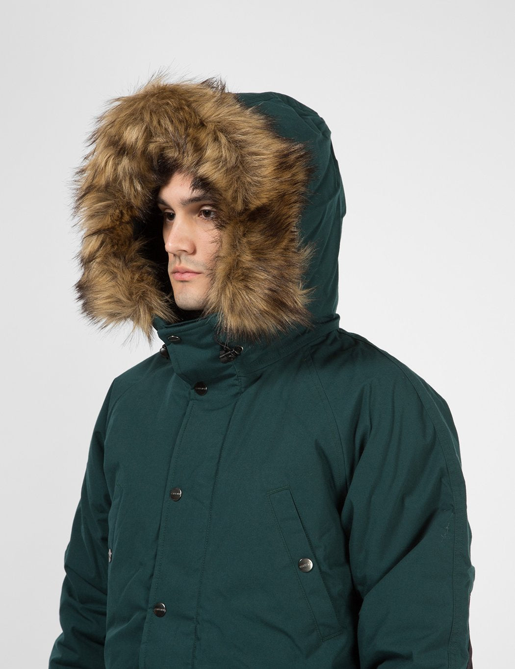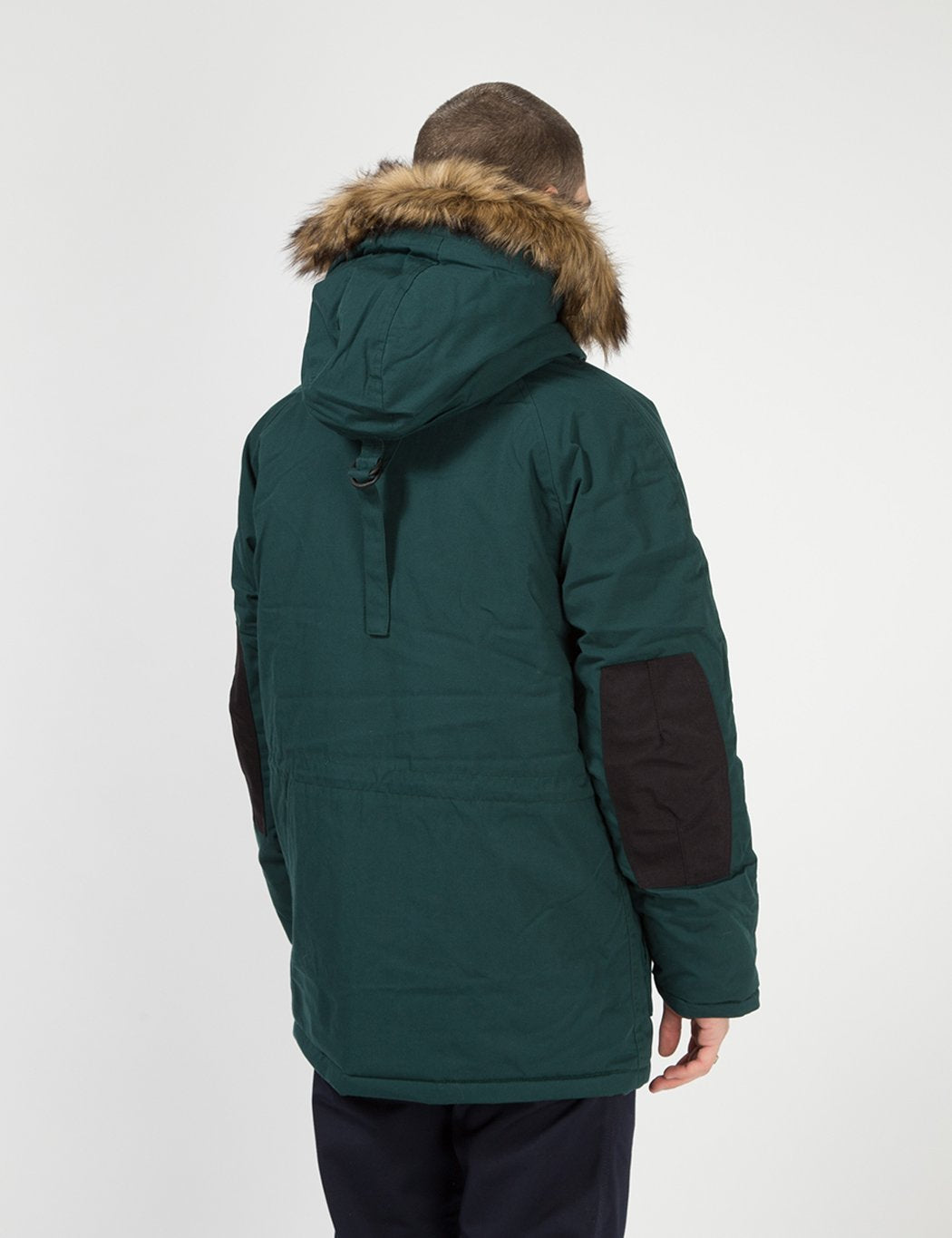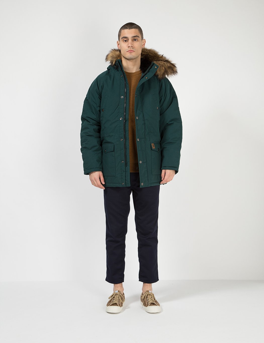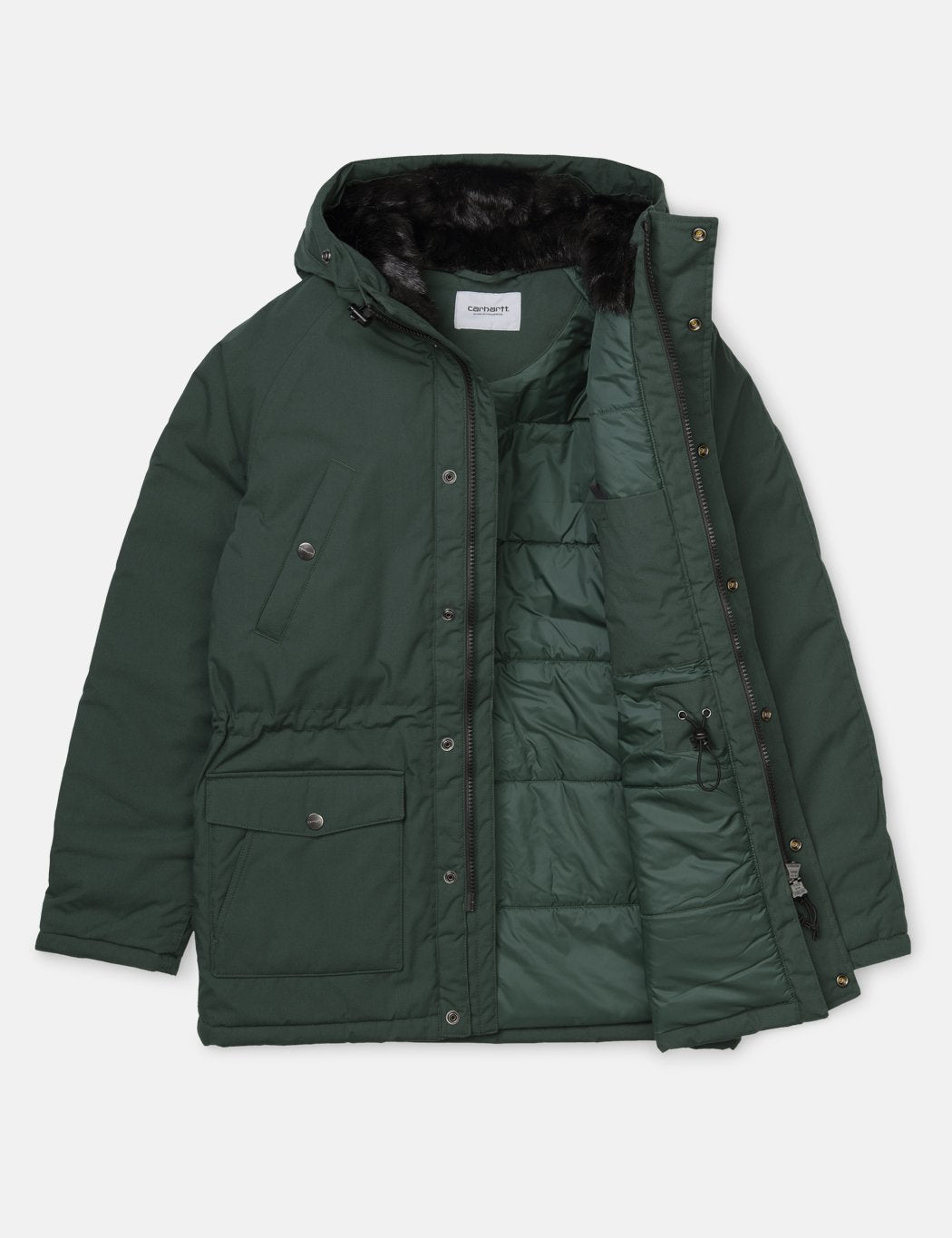The Carhartt WIP Trapper Parka in Dark Fir Green / Black from the Fall/Winter 2019 collection.