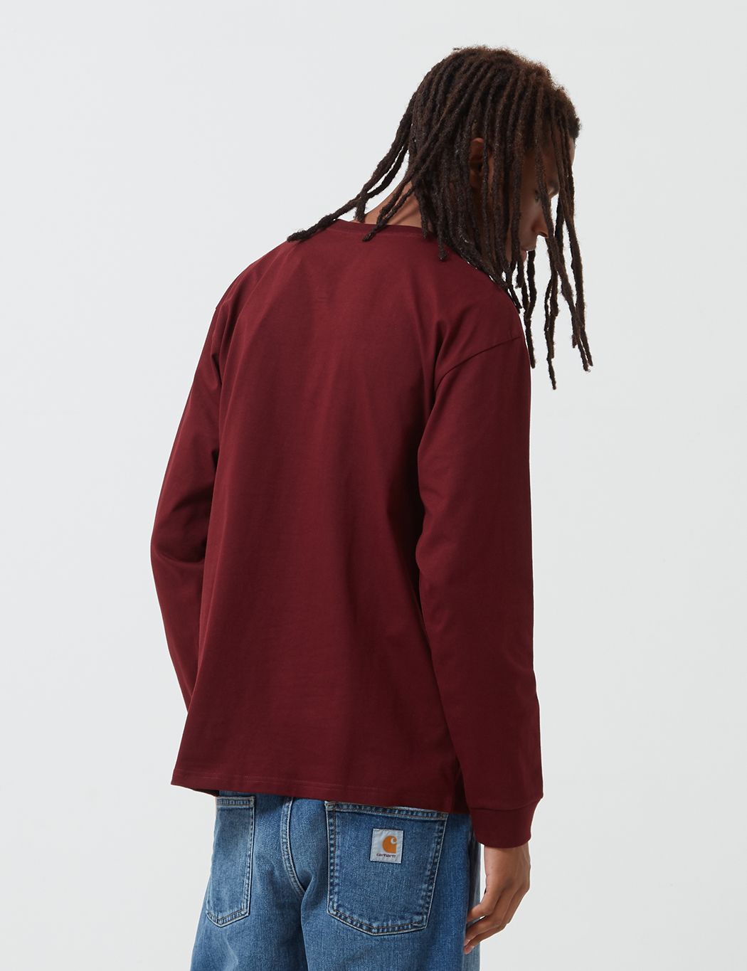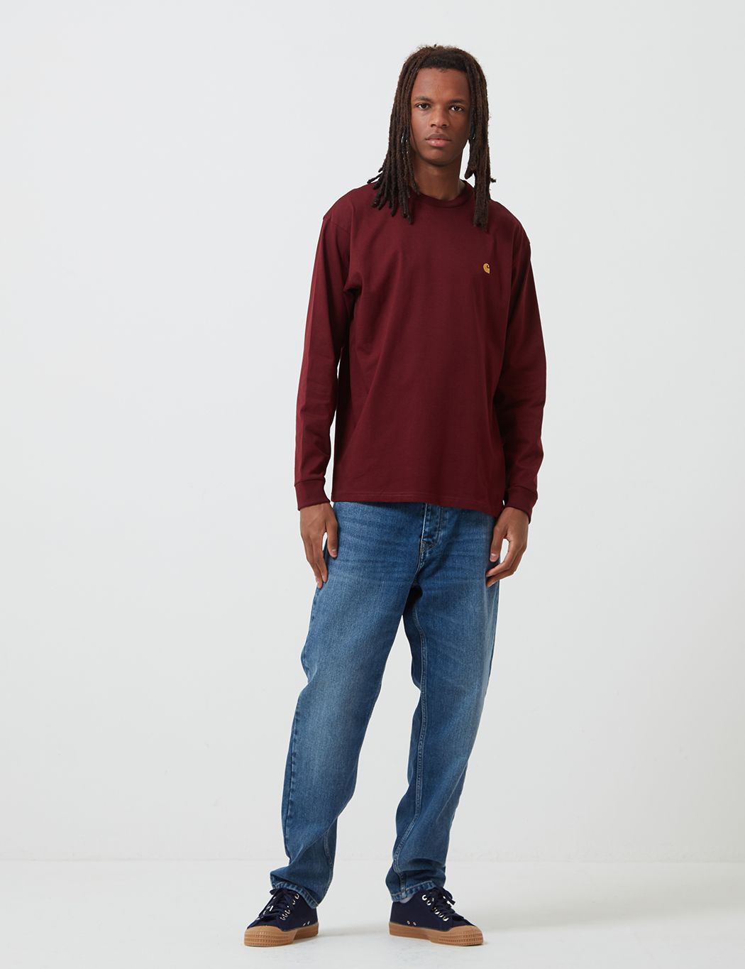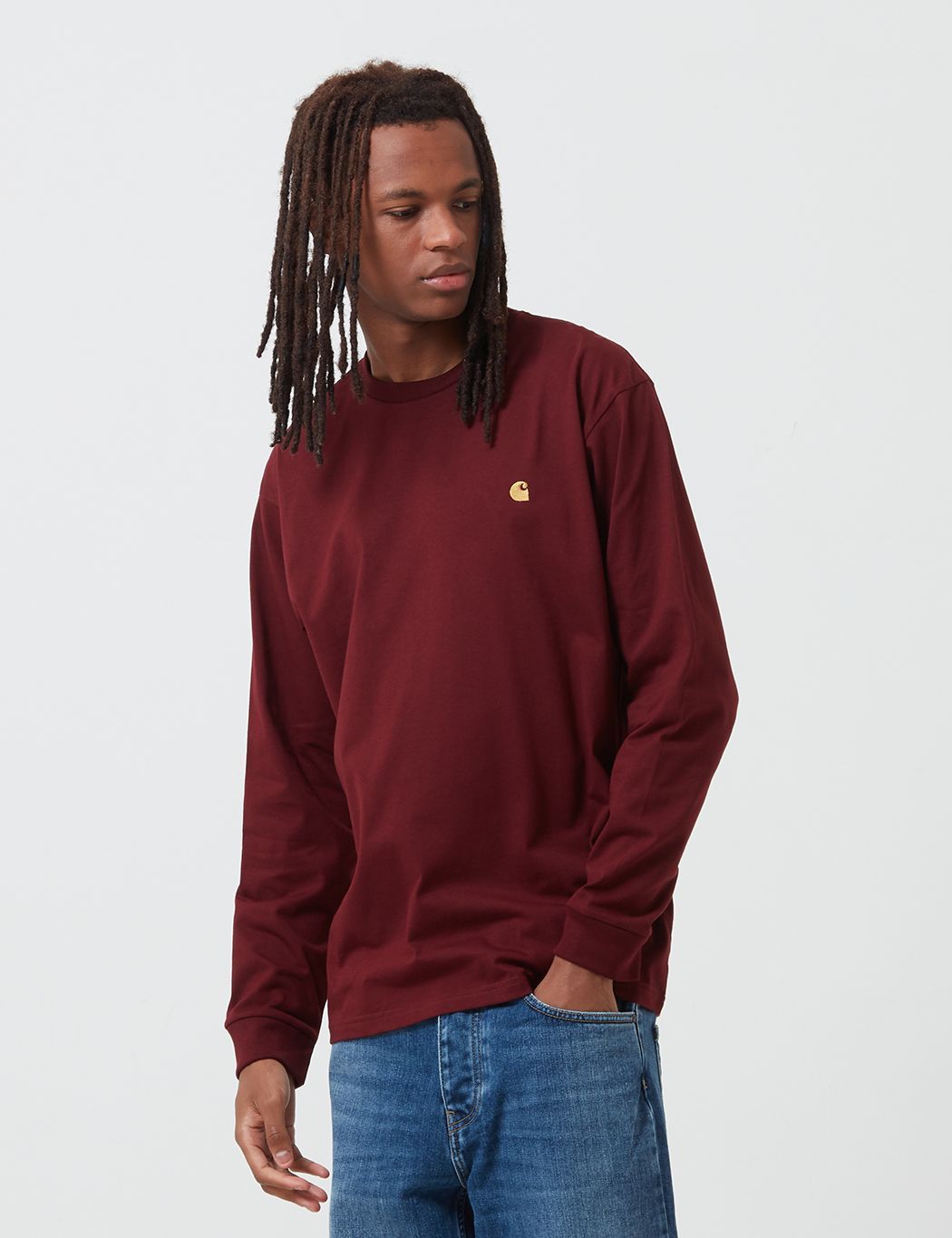 The Carhartt Work In Progress Chase long sleeve t-shirt in Bordeaux with gold embroidery from the Carhartt Chase collection.