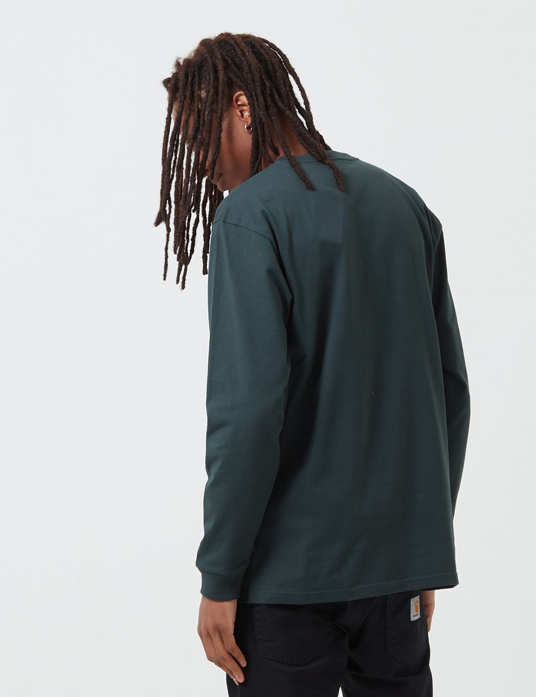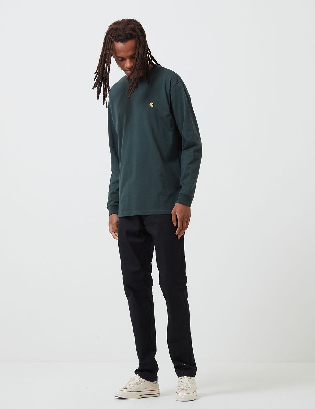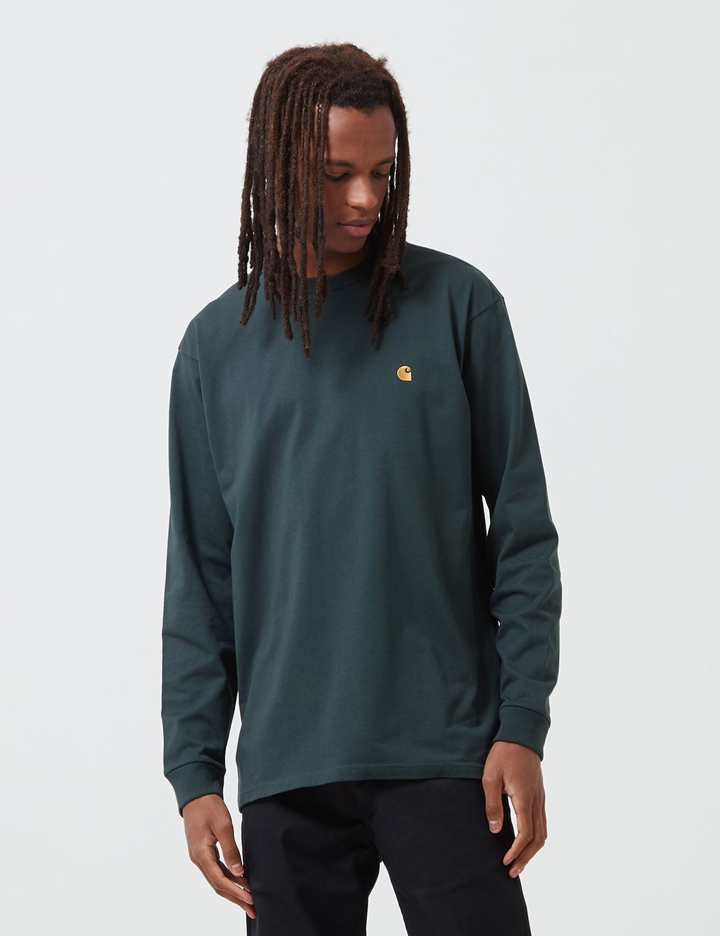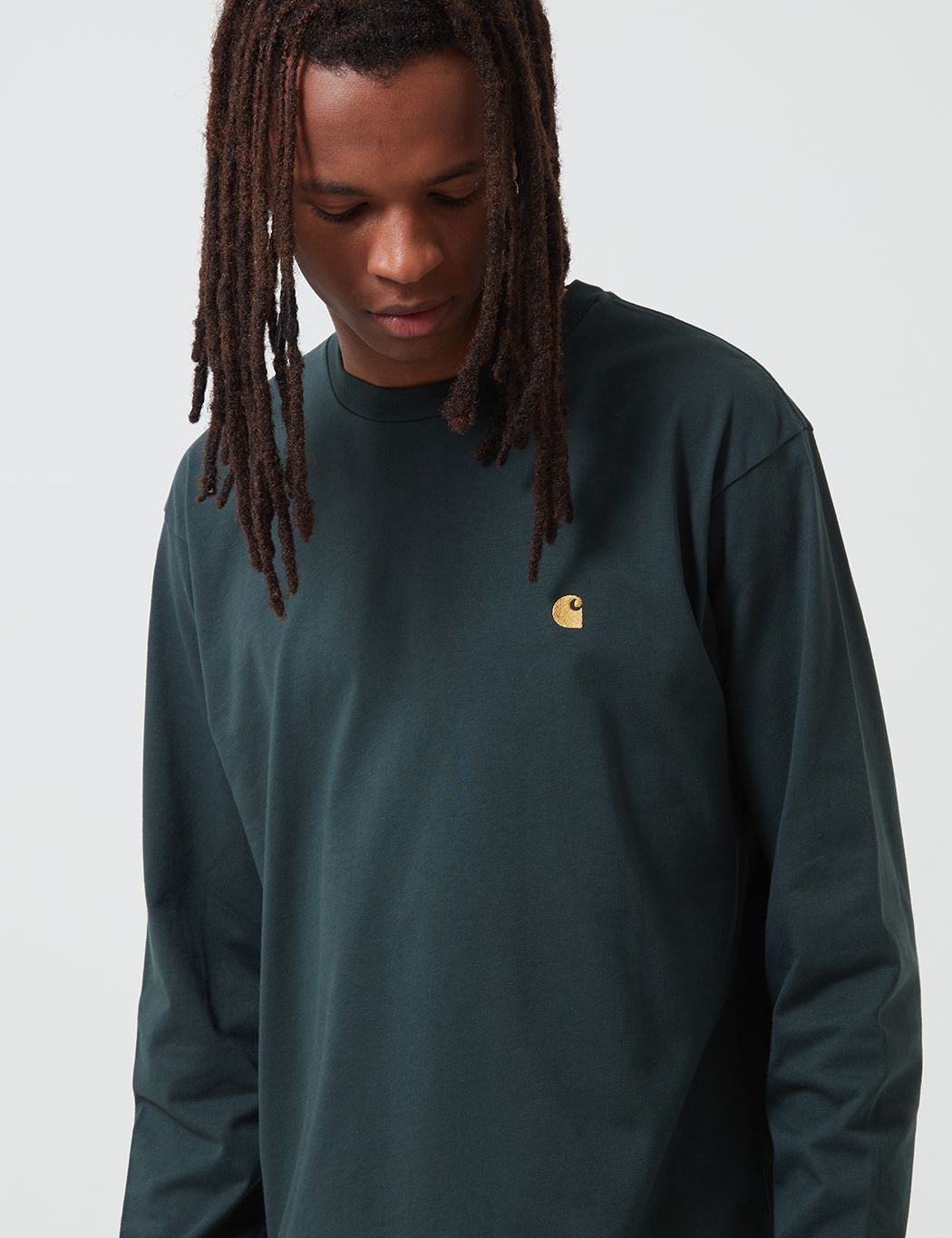 The Carhartt Work In Progress Chase long sleeve t-shirt in dark teal with gold embroidery from the Carhartt Chase collection.