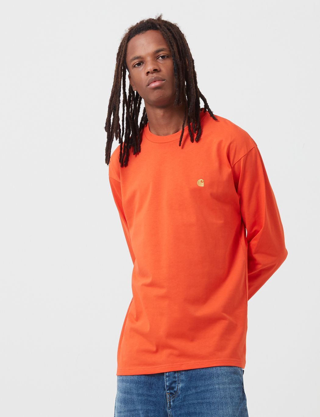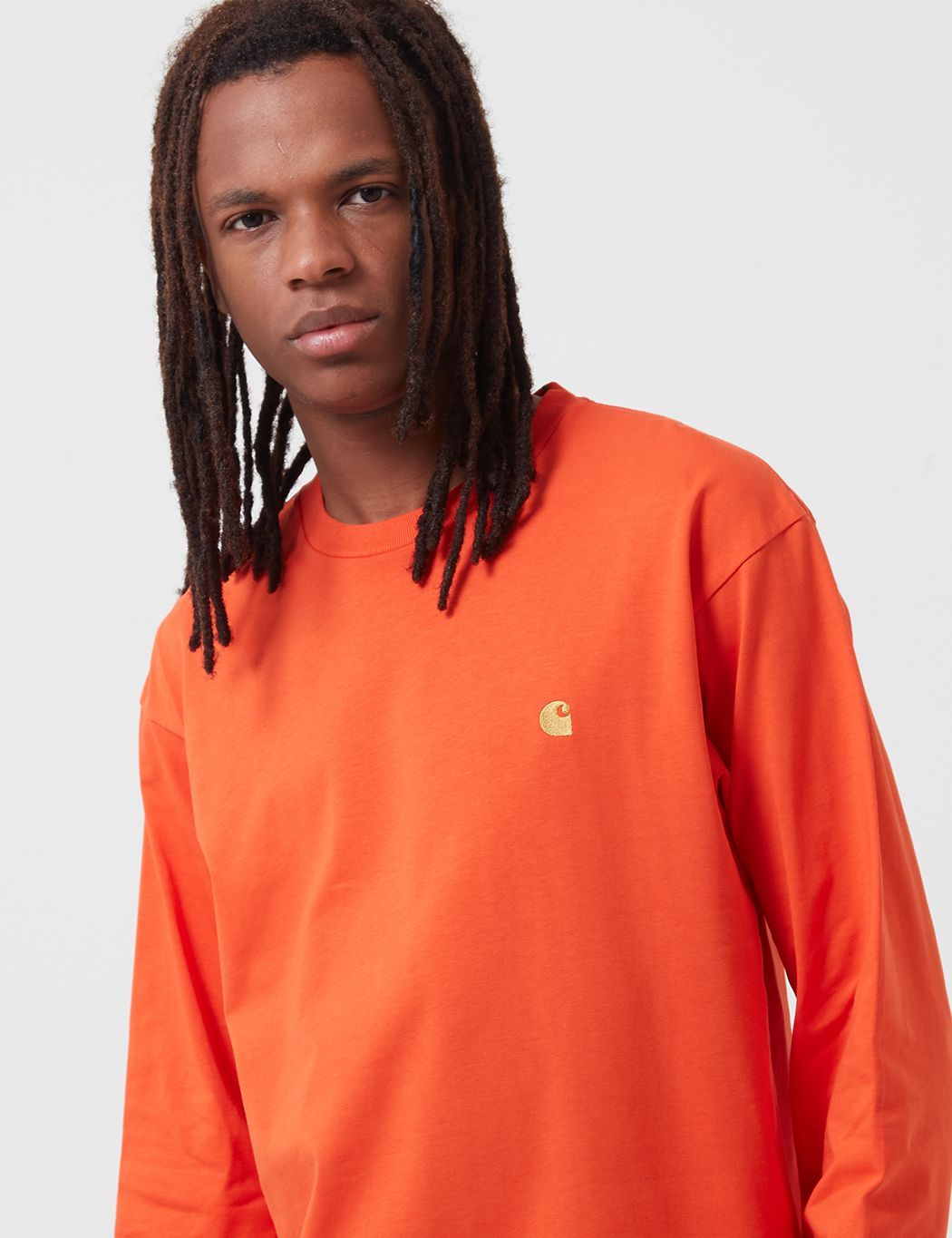 The Carhartt Work In Progress Chase long sleeve t-shirt in safety orange with gold embroidery from the Carhartt Chase collection.