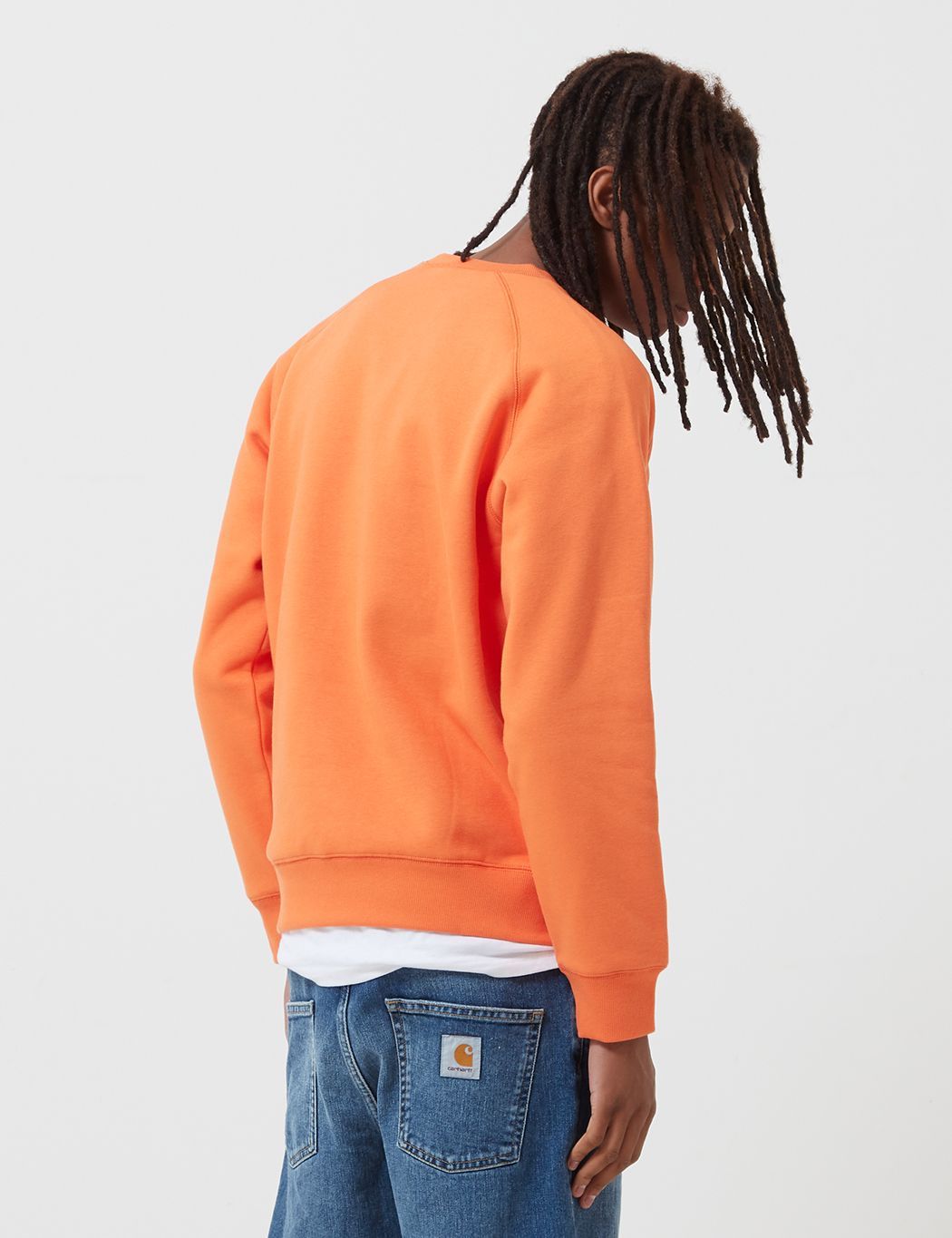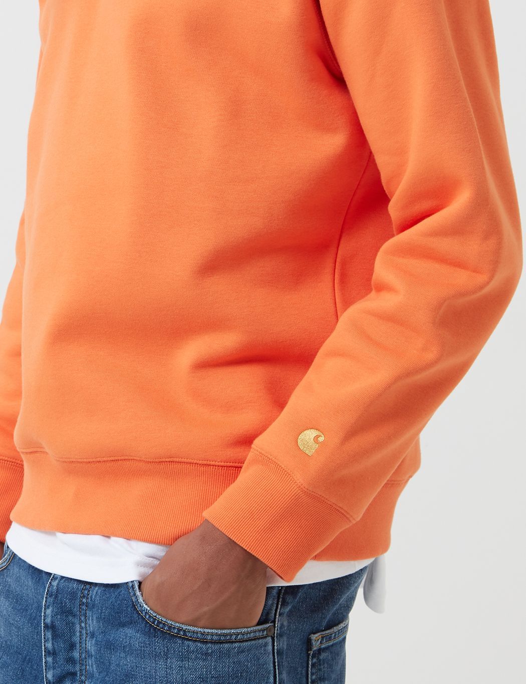 The Carhartt Chase sweatshirt in Clockwork Orange with Gold embroidery from the Carhartt Chase sweat program.