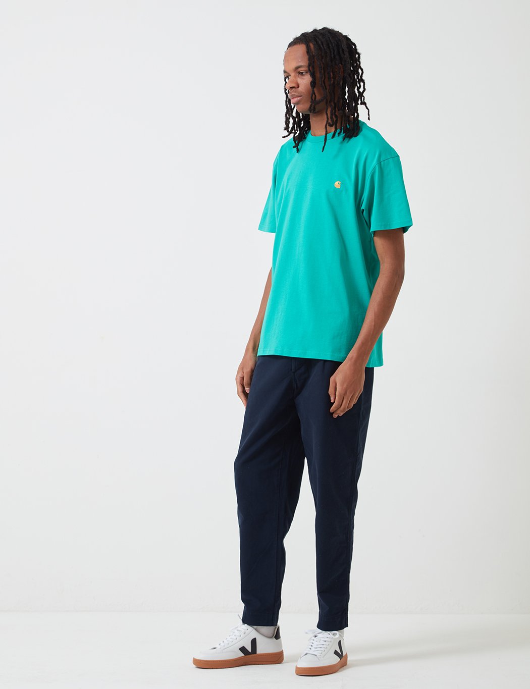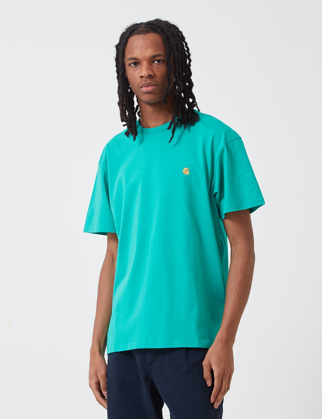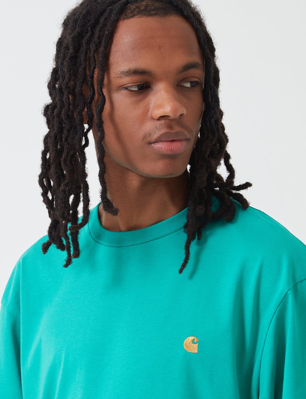 The Carhartt Work In Progress Chase t-shirt yoda green with gold embroidery from the Carhartt Spring/Summer 2020 Chase collection.