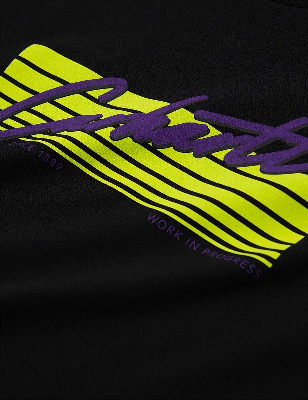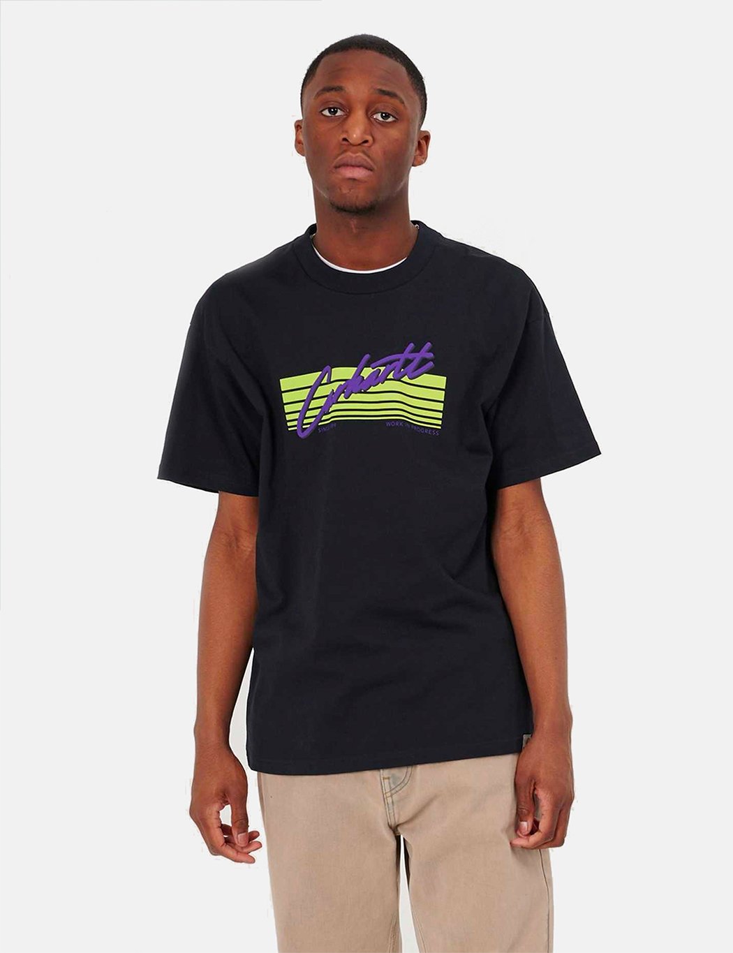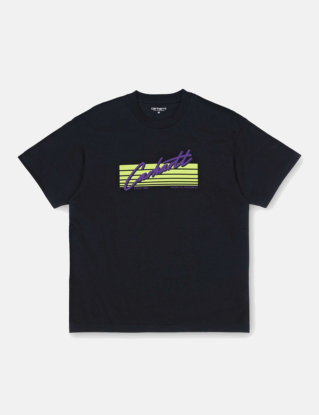 Short Sleeve loose fitting Horizon Script Carhartt t-shirt with Miami vice style motif on chest in yellow and purple.