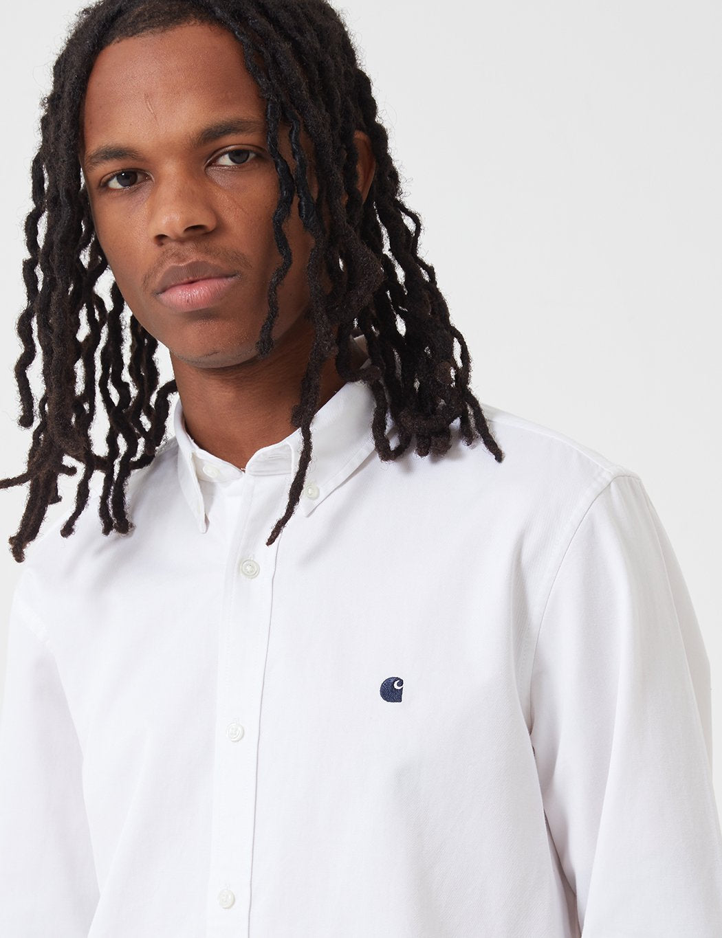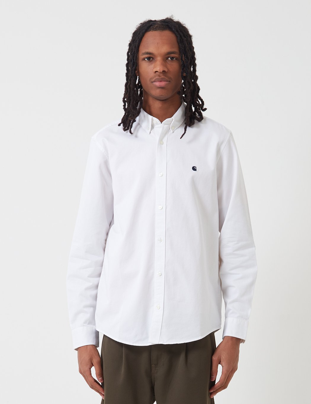 From Carhartt the Madison shirt in white with dark navy Carhartt branding on the chest from the Carhartt shirts Holiday 2019 collection.
