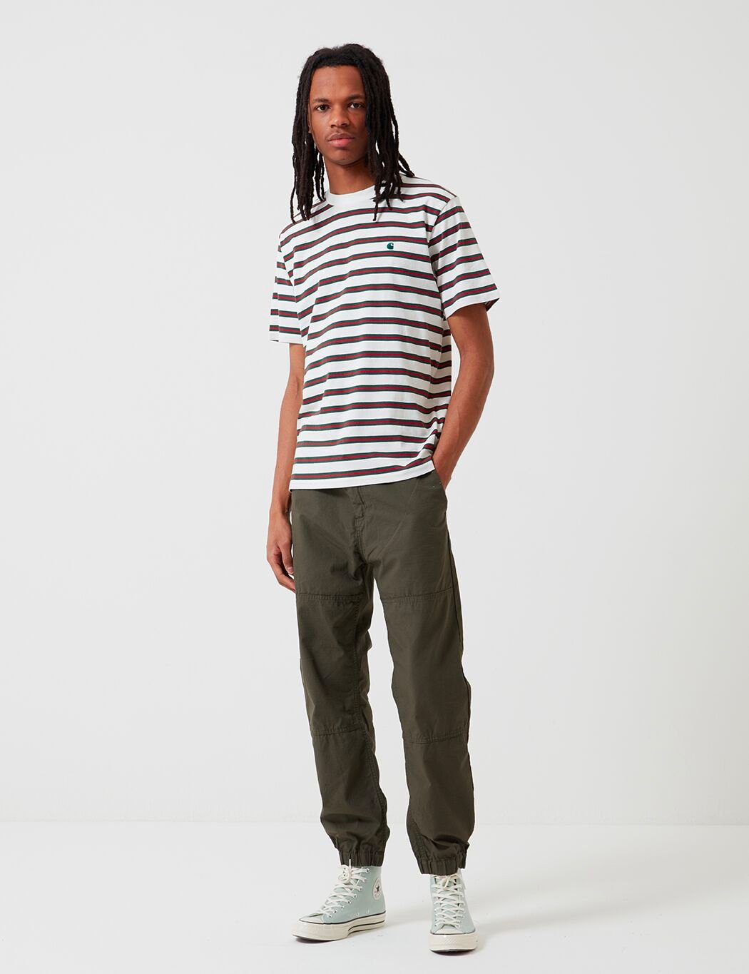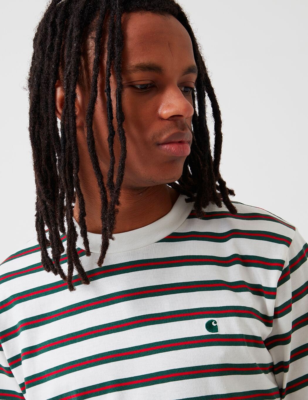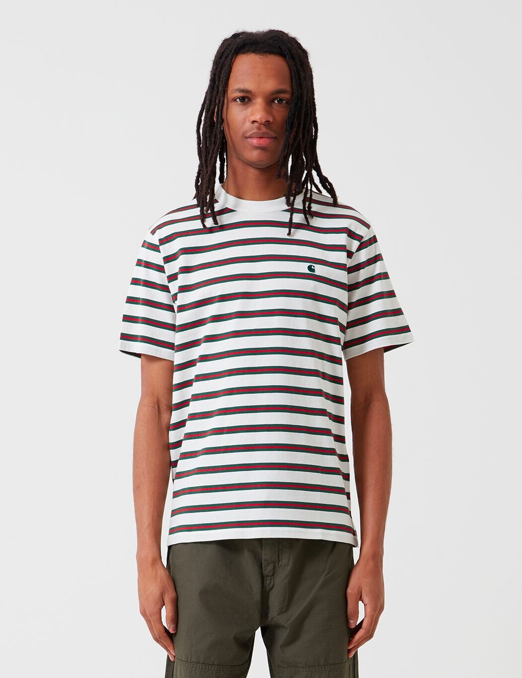 The Carhartt WIP Oakland Striped t-shirt in wax white and treehouse green from the Carhartt Spring/Summer 2020 Chase collection.