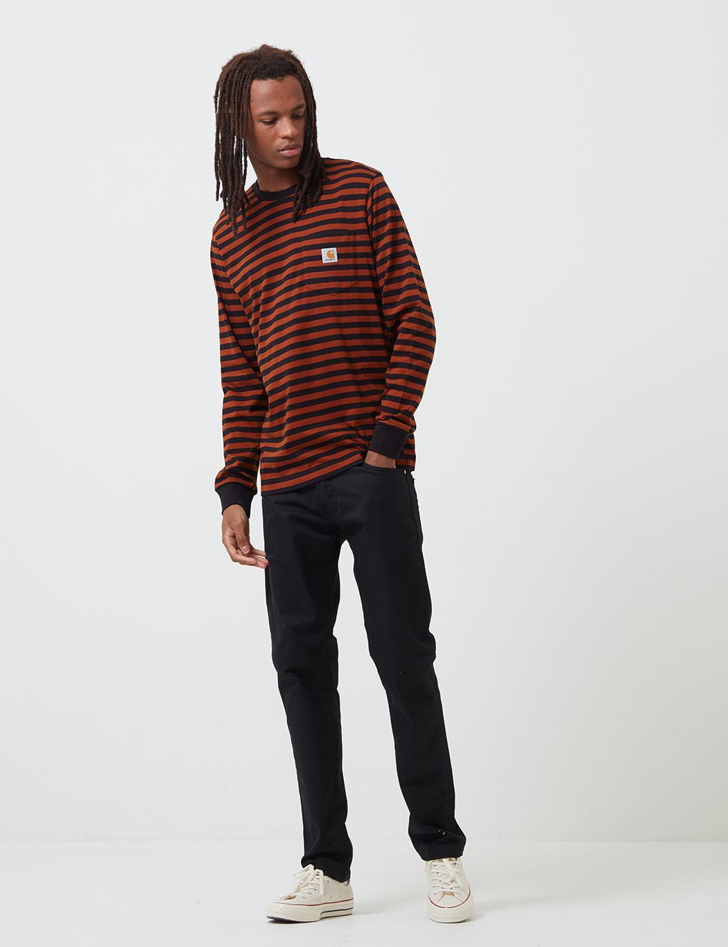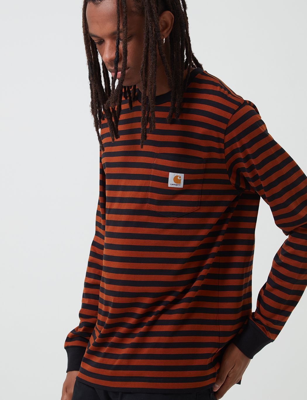 The Carhartt Work In Progress Parker Long Sleeve T-Shirt in black and brandy stripe from the Carhartt t-shirts collection.