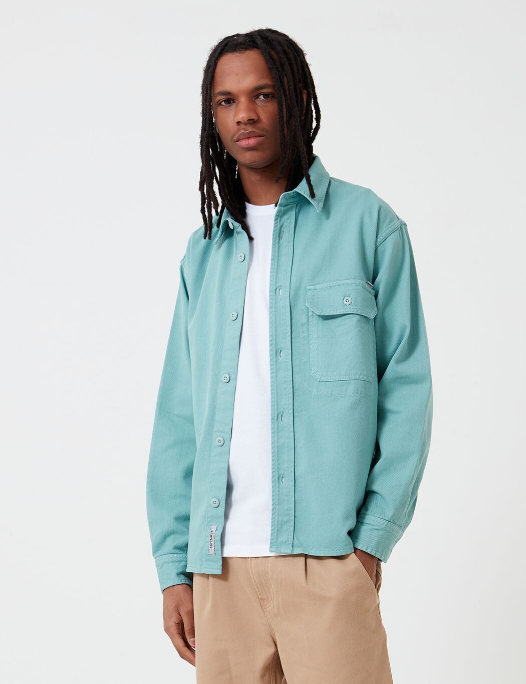 Loose fitting Reno shirt, in a heavy weight 10 oz dodge colour denim cotton twill, can be worn as an overshirt. Feature single chest pocket with tab branding, in garment dyed fabric.