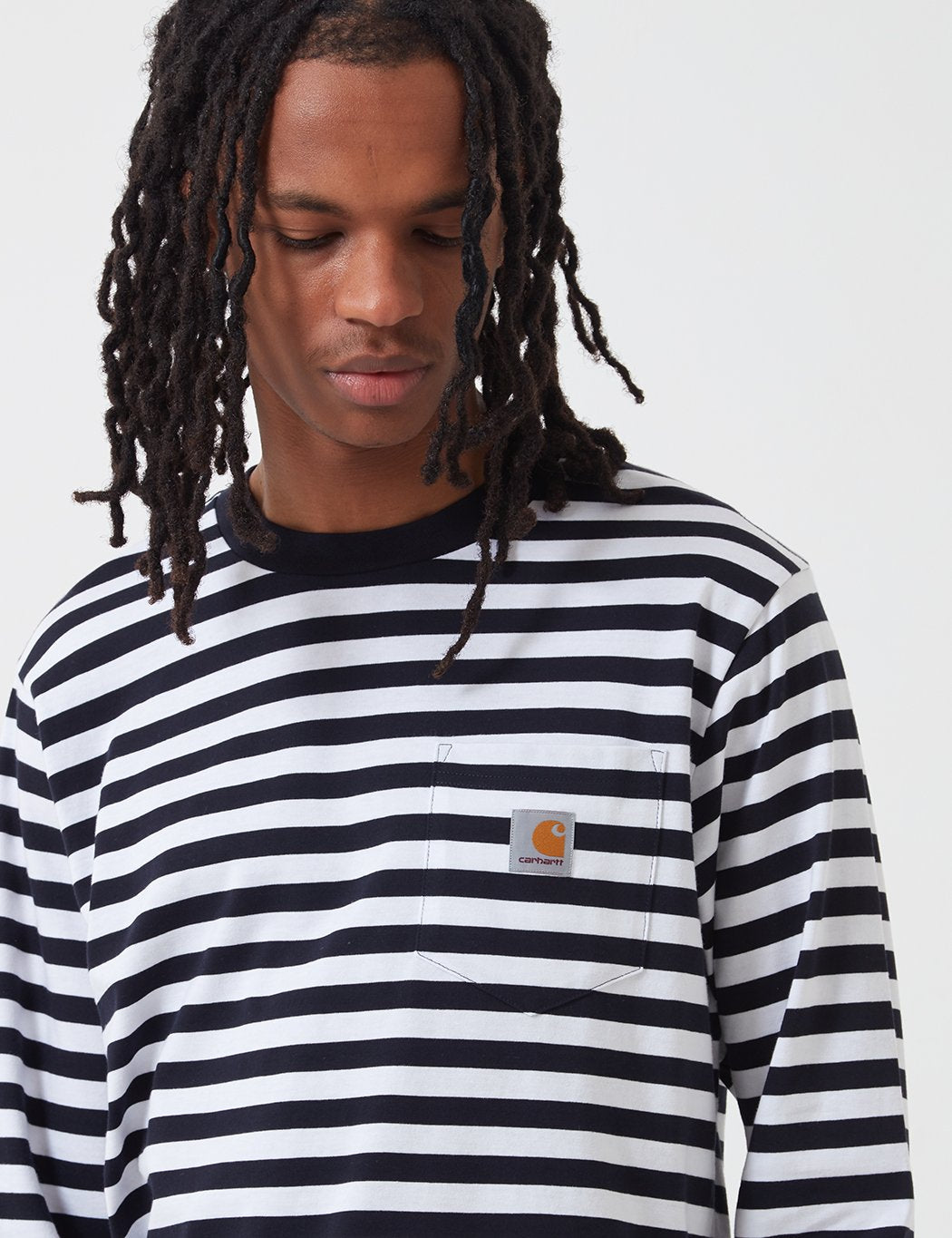 The Carhartt Scotty long sleeve pocket tshirt in dark navy blue and white stripes from the Carhartt t-shirts Spring/Summer 2020 collection.
