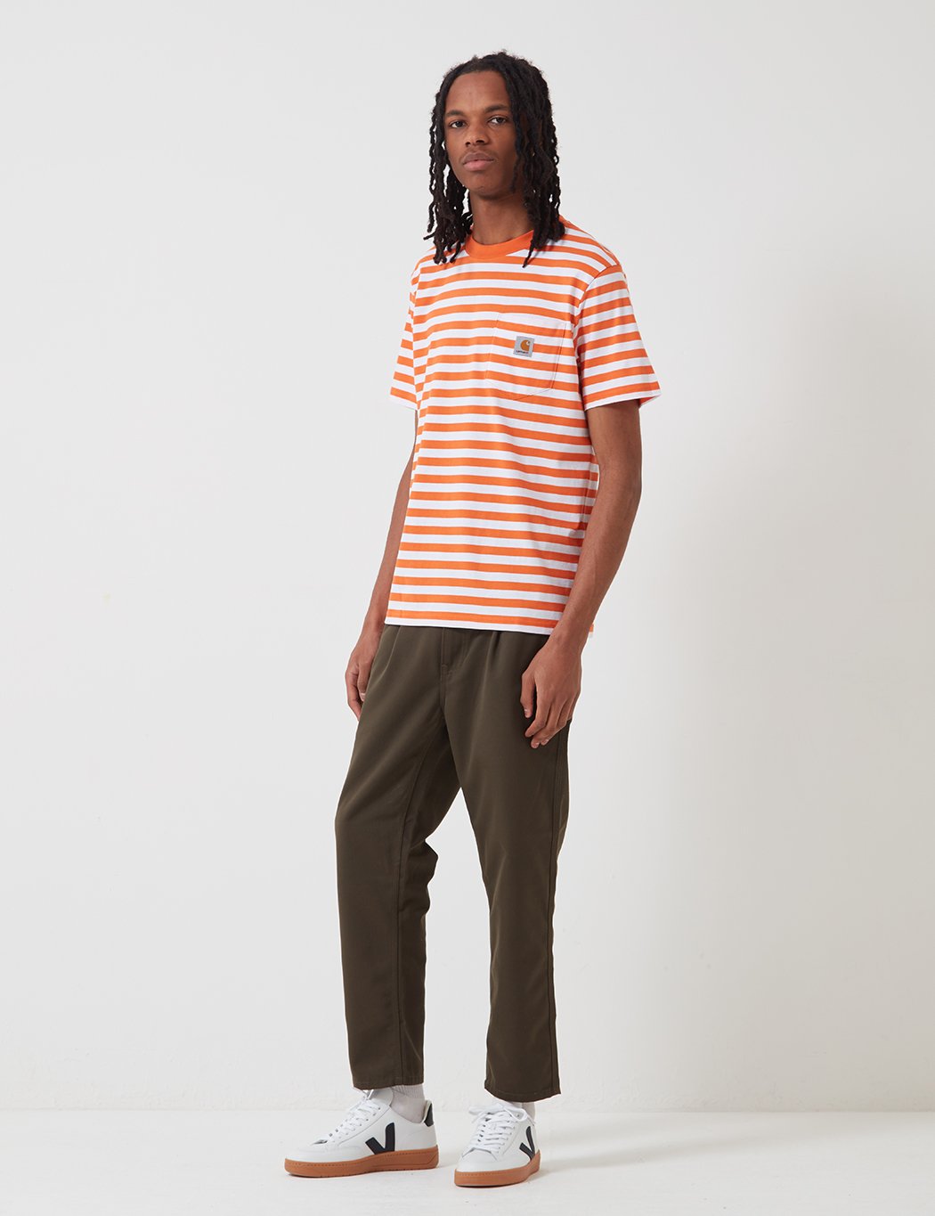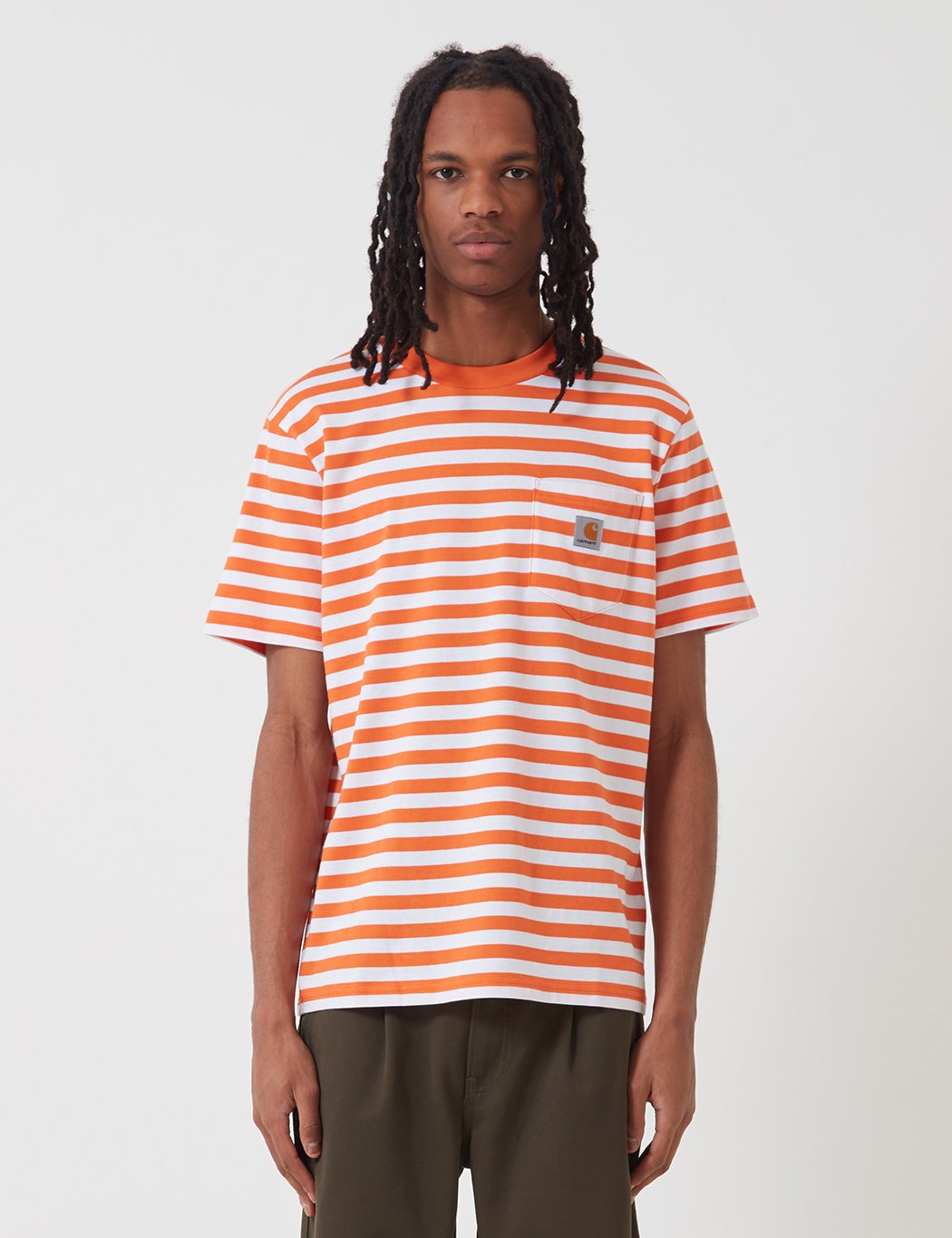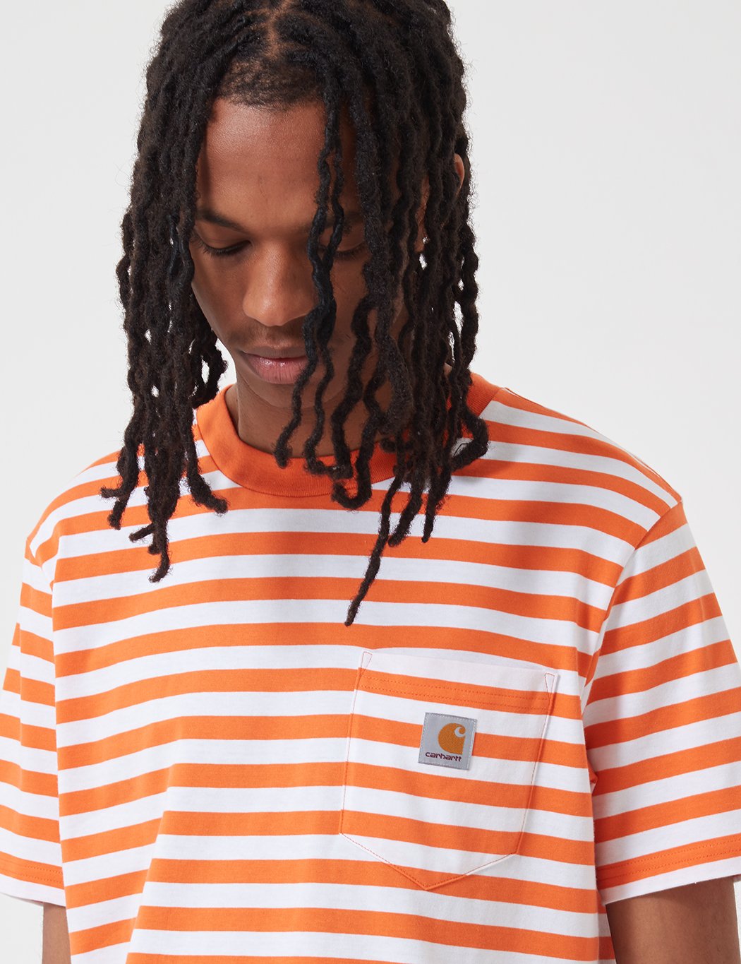 The Carhartt Scotty Pocket tshirt in clockwork orange and white stripes from the Carhartt t-shirts Spring/Summer 2020 collection.