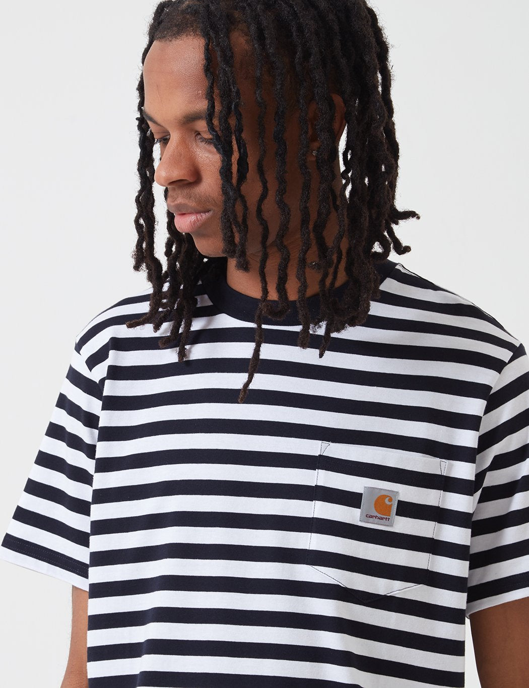 The Carhartt Scotty Pocket tshirt in dark navy blue and white stripes from the Carhartt t-shirts Spring/Summer 2020 collection.