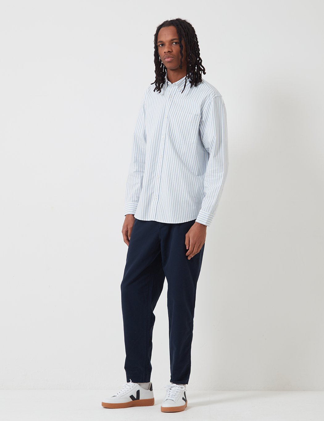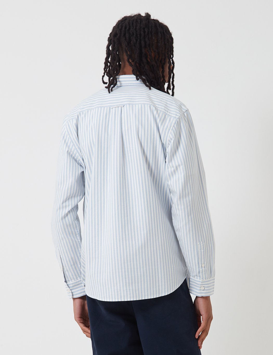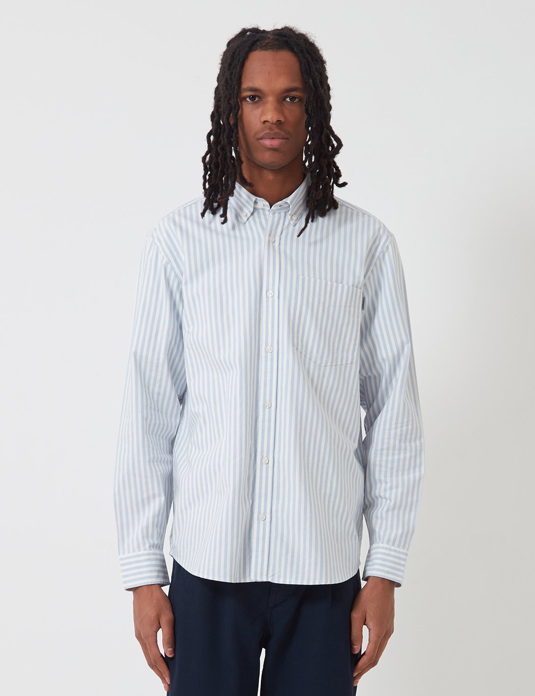 The Carhartt-WIP Simon oxford shirt featuring 1x1 vertical stripe, one chest pocket with classic Carhartt tab branding and button down collar.