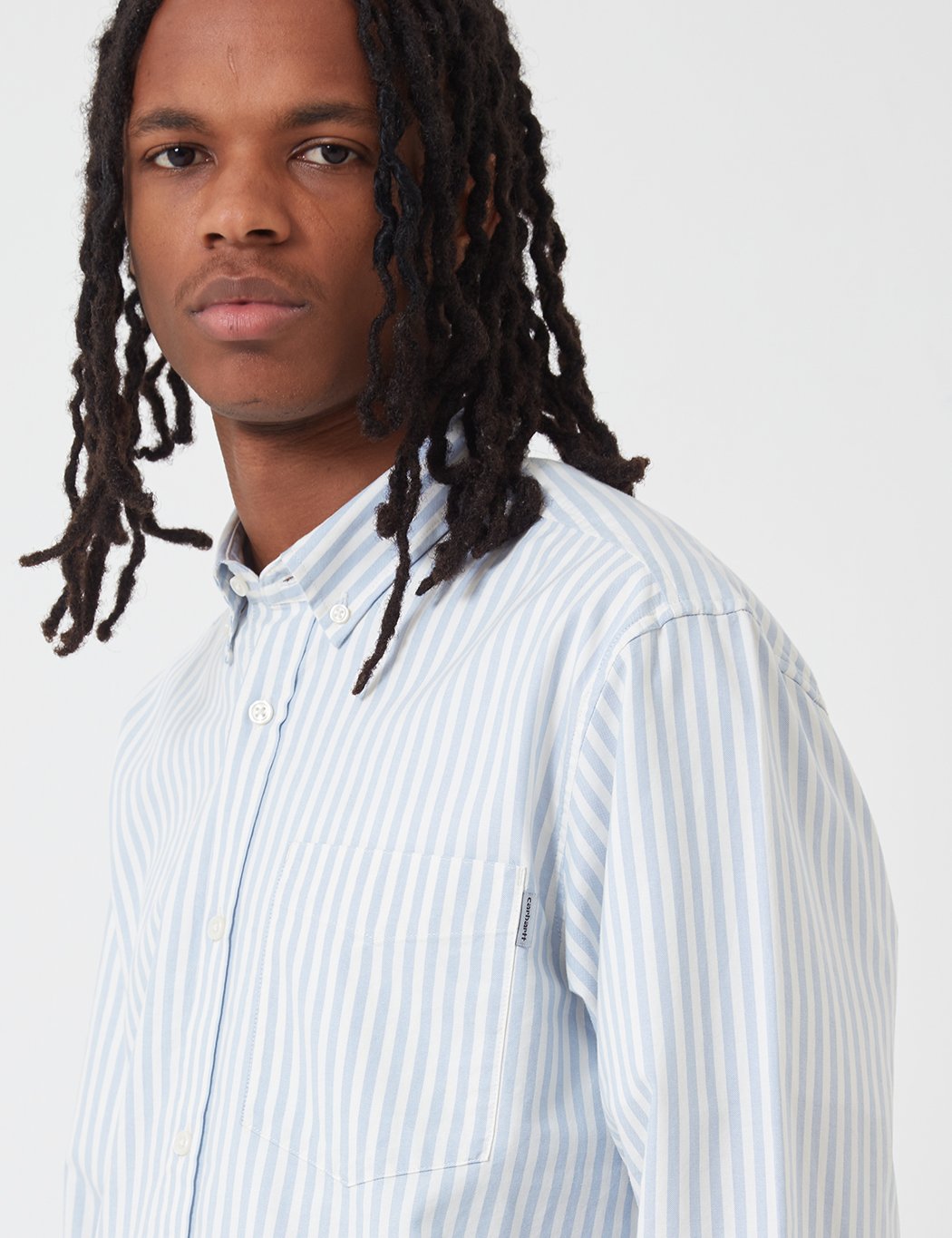 The Carhartt L/S Simon shirt in Bleach Blue vertical stripe from the Carhartt shirts Holiday 2019 collection.