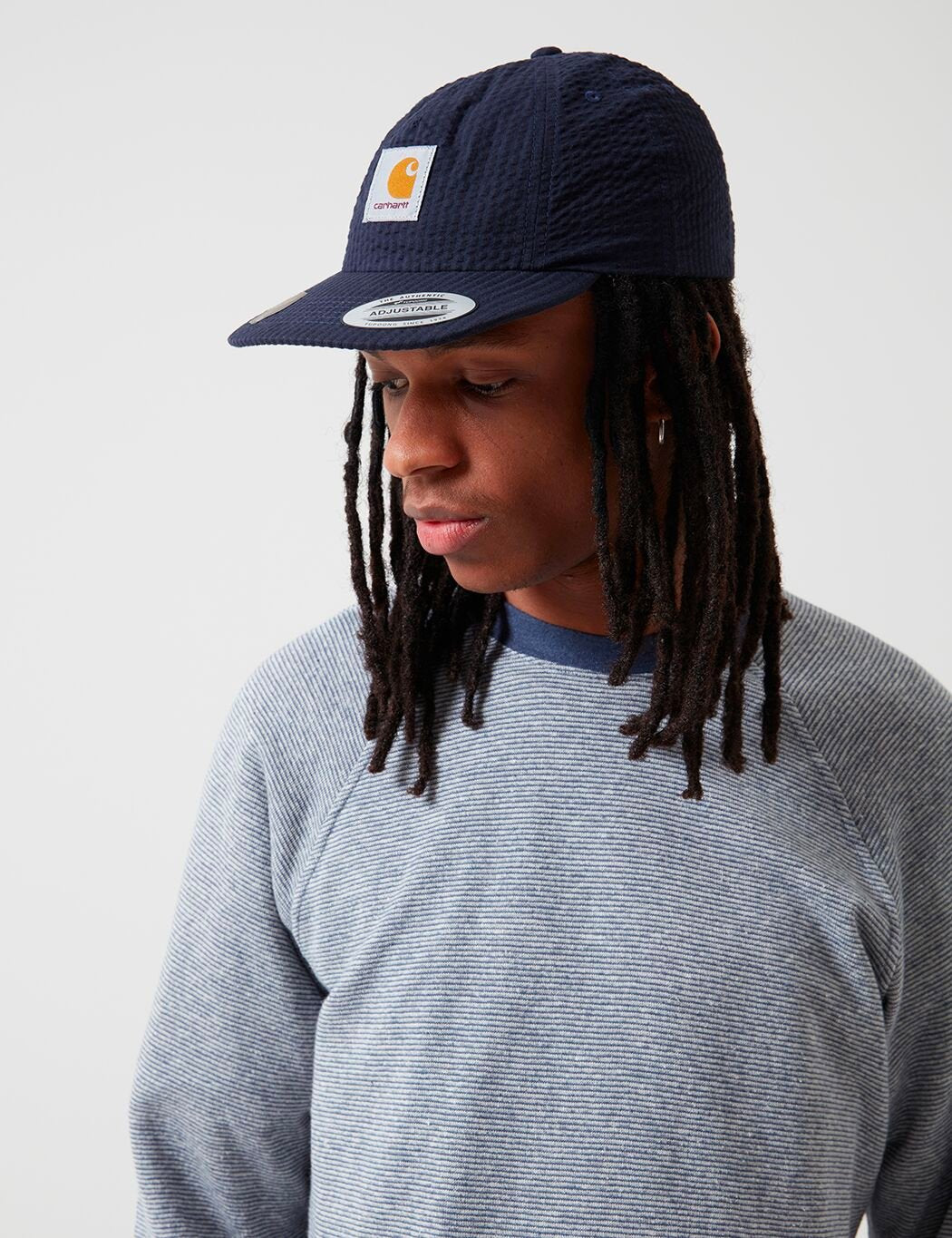 The Southfield Carhartt cap features seven panel construction in cotton seersucker fabrication, this cap is unlined, has a flexible peak, and is adjustable at the rear. Features the Carhartt WIP classic patch branding at front.Product Details: