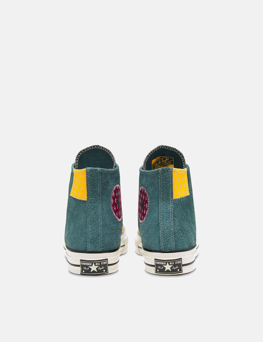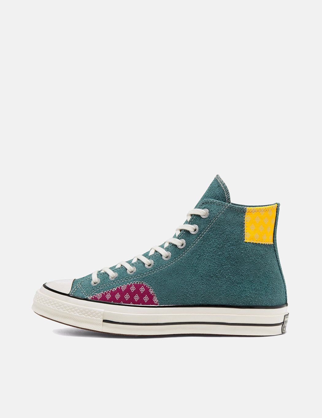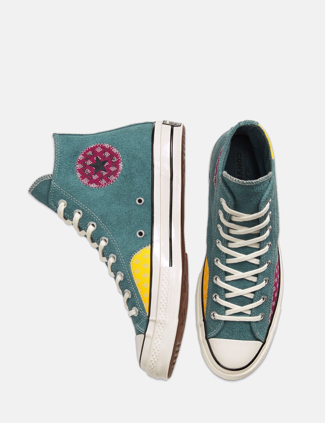 A creative preppy reinterpretation of the original Converse 1970's basketball silhouette. The classic hi top in suede with patchwork panelling details. Featuring a winged tongue stitching for durability, an OrthoLite insole for comfort, and classic 35mm rubber taping.