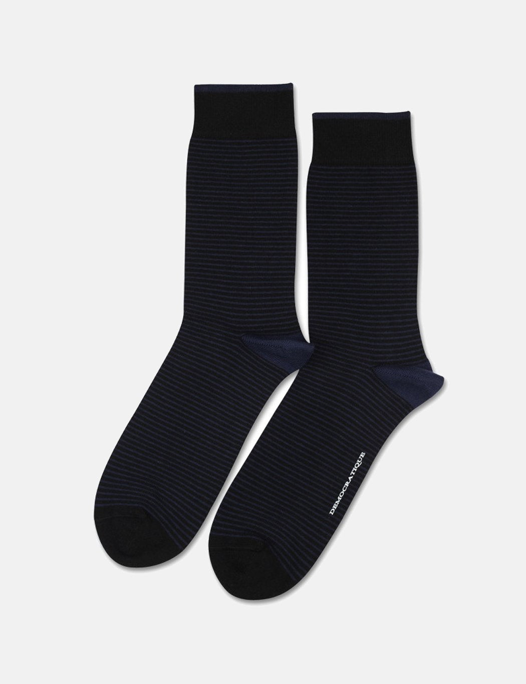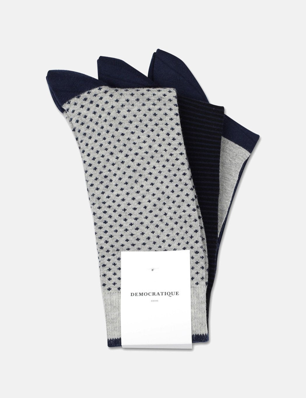 From Democratique or Copenhagen, Denmark the Solid Socks three pack featuring navy dots, navy stripes and solid black from the Democratique socks core collection.