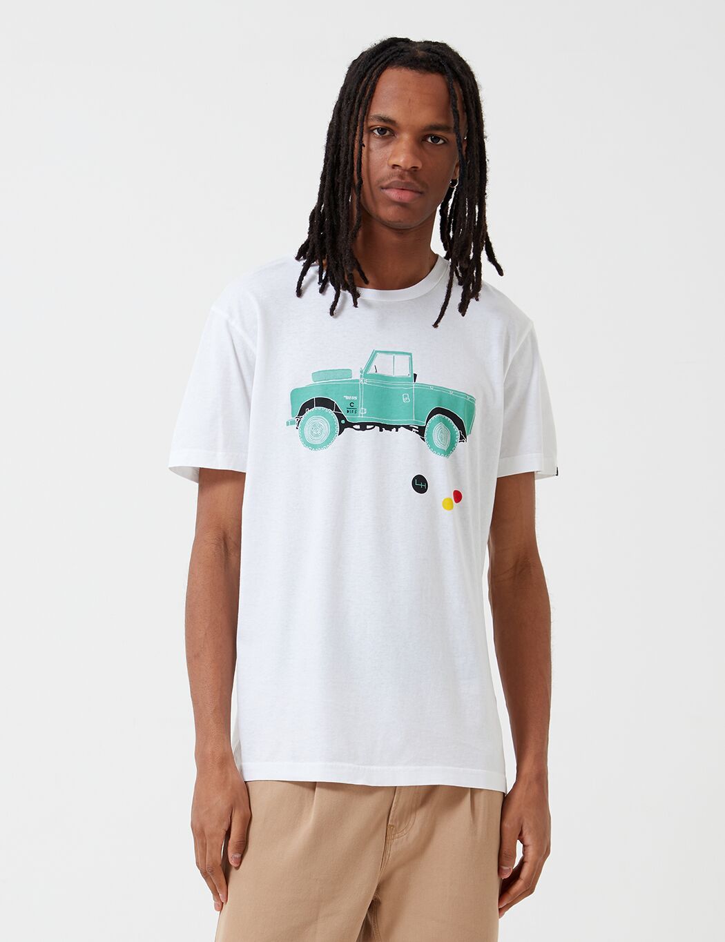Short sleeve cotton jersey t-shirt featuring Landie graphic on chest and simple pleasures motif on back. Heavy weight t-shirt with a heavy enzyme wash.