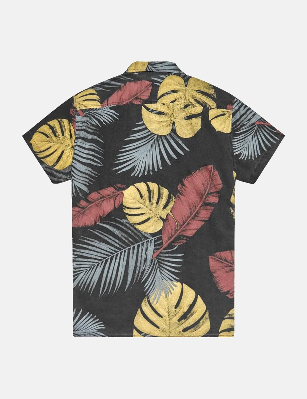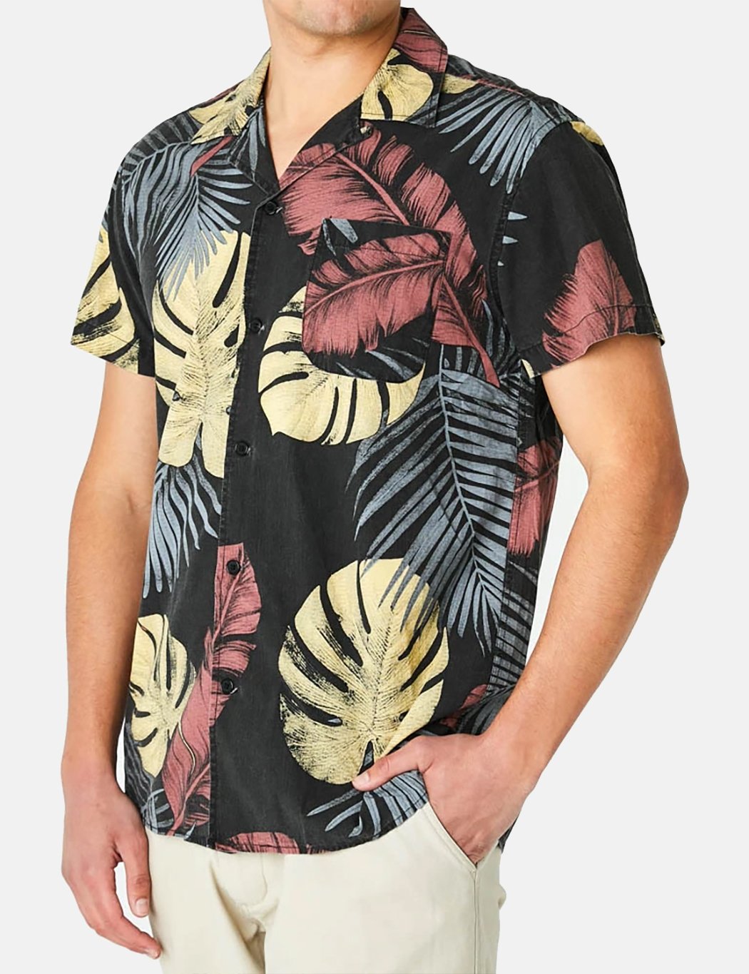 Relaxed fit summer shirt with all over multi colour Palm Yardage graphic, open rever collar. Made in 100% Rayon Fabrication With Heavy Enzyme Stone Wash