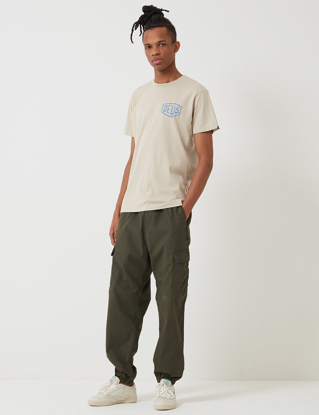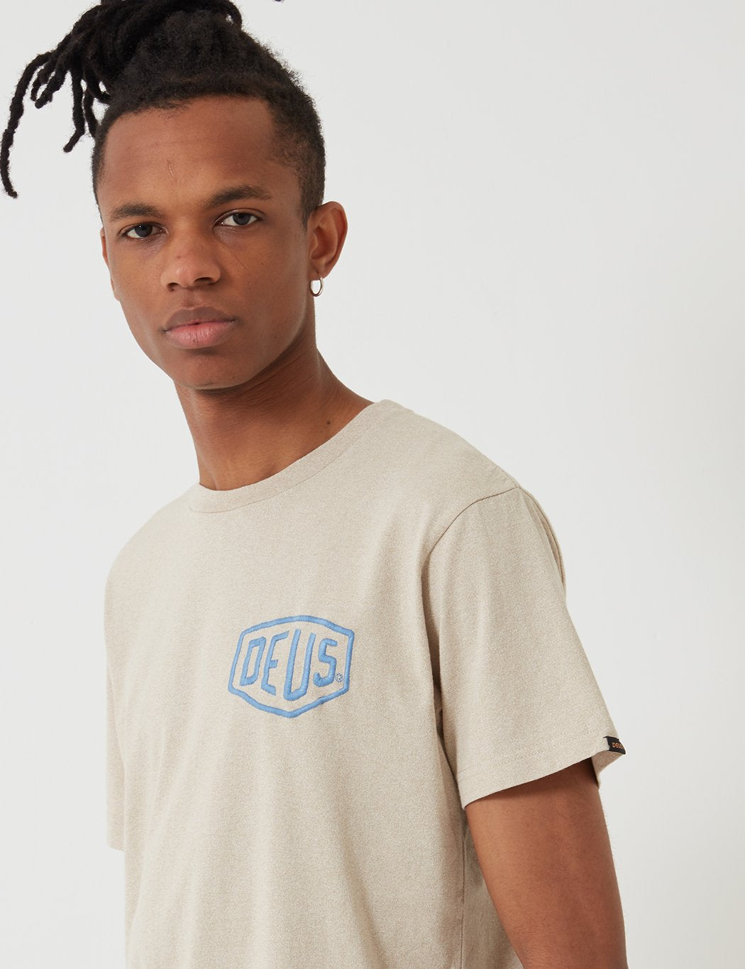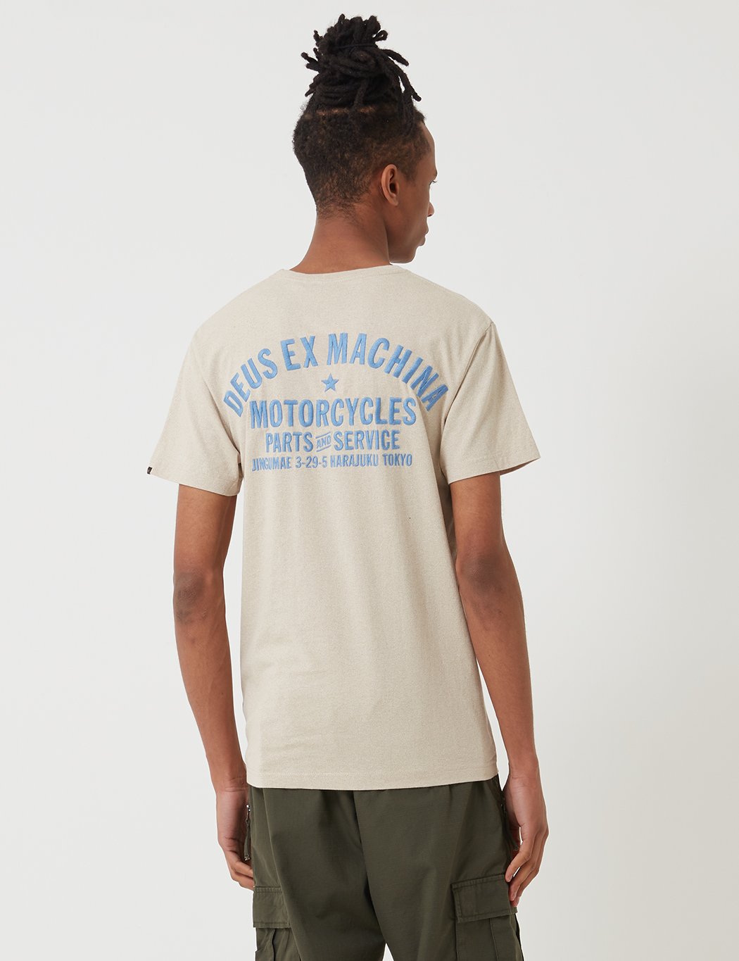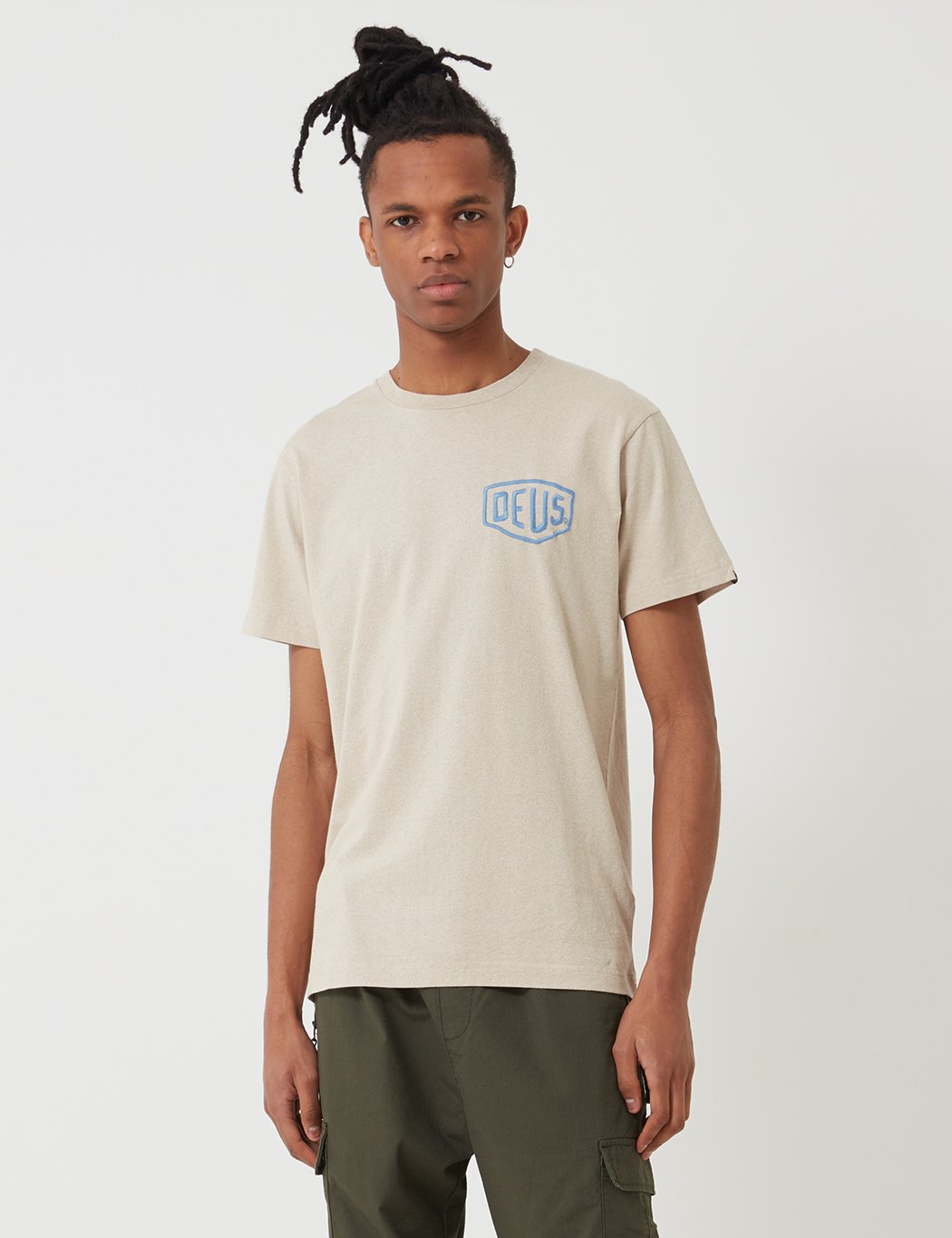 The Deus Ex Machina Premium Address Tokyo t-shirt in safari marle from the Deus Spring/Summer 2019 collection. This Deus t-shirt is a regular fit tee with chest and back Address embroidery in a yarn cotton marle jersey fabrication with heavy enzyme stone wash.