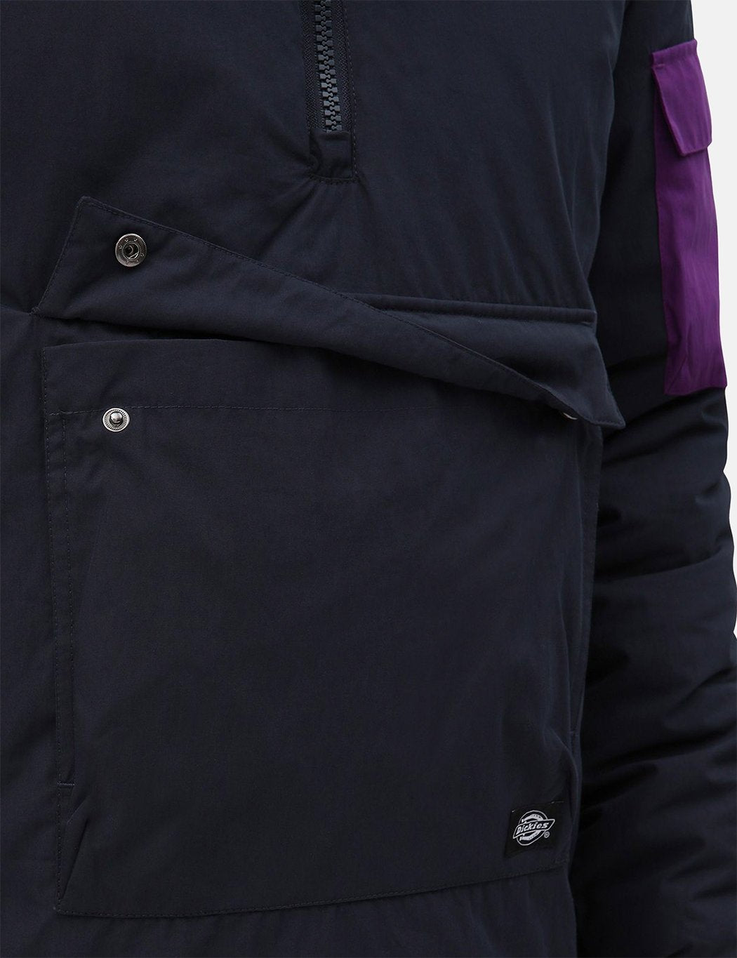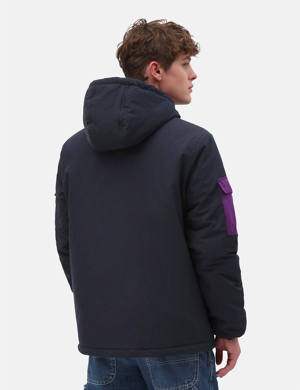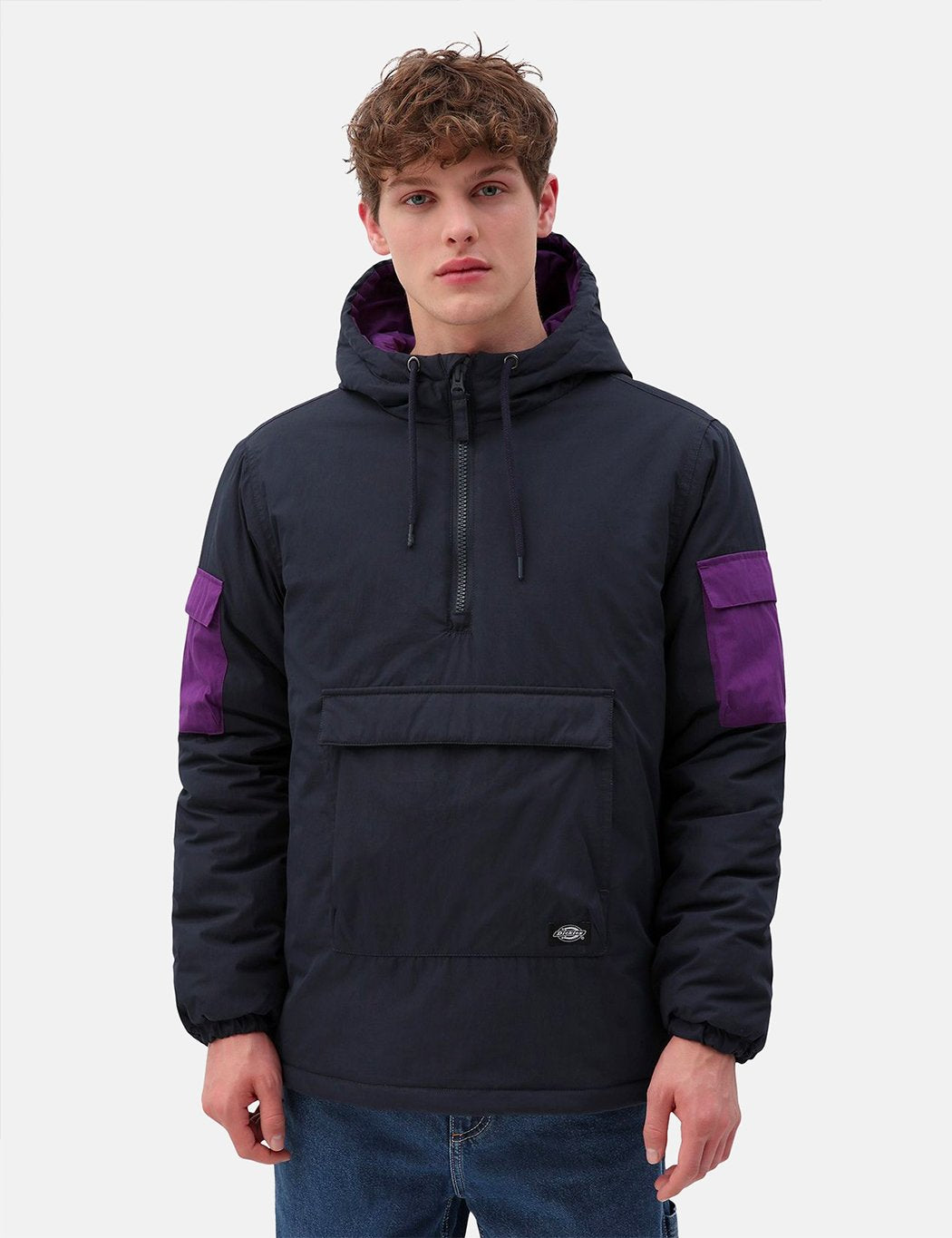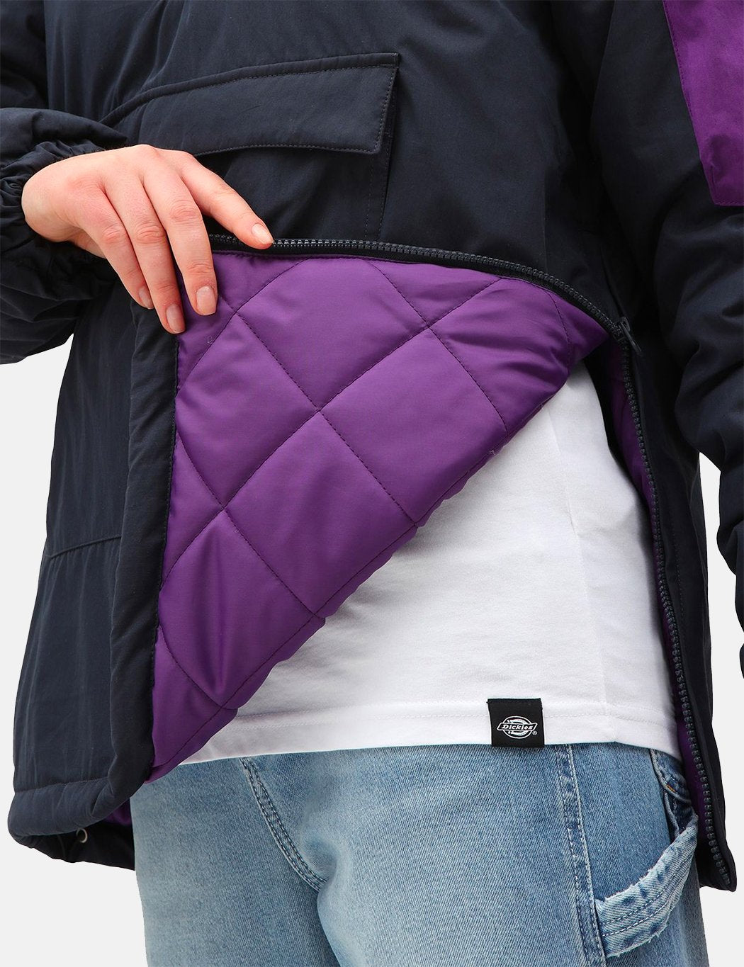 A padded hooded field parka from Dickies, featuring padded lining, large front flap closure pocket, arm patch pockets in purple, quarter zip neck and drawstring hood.
