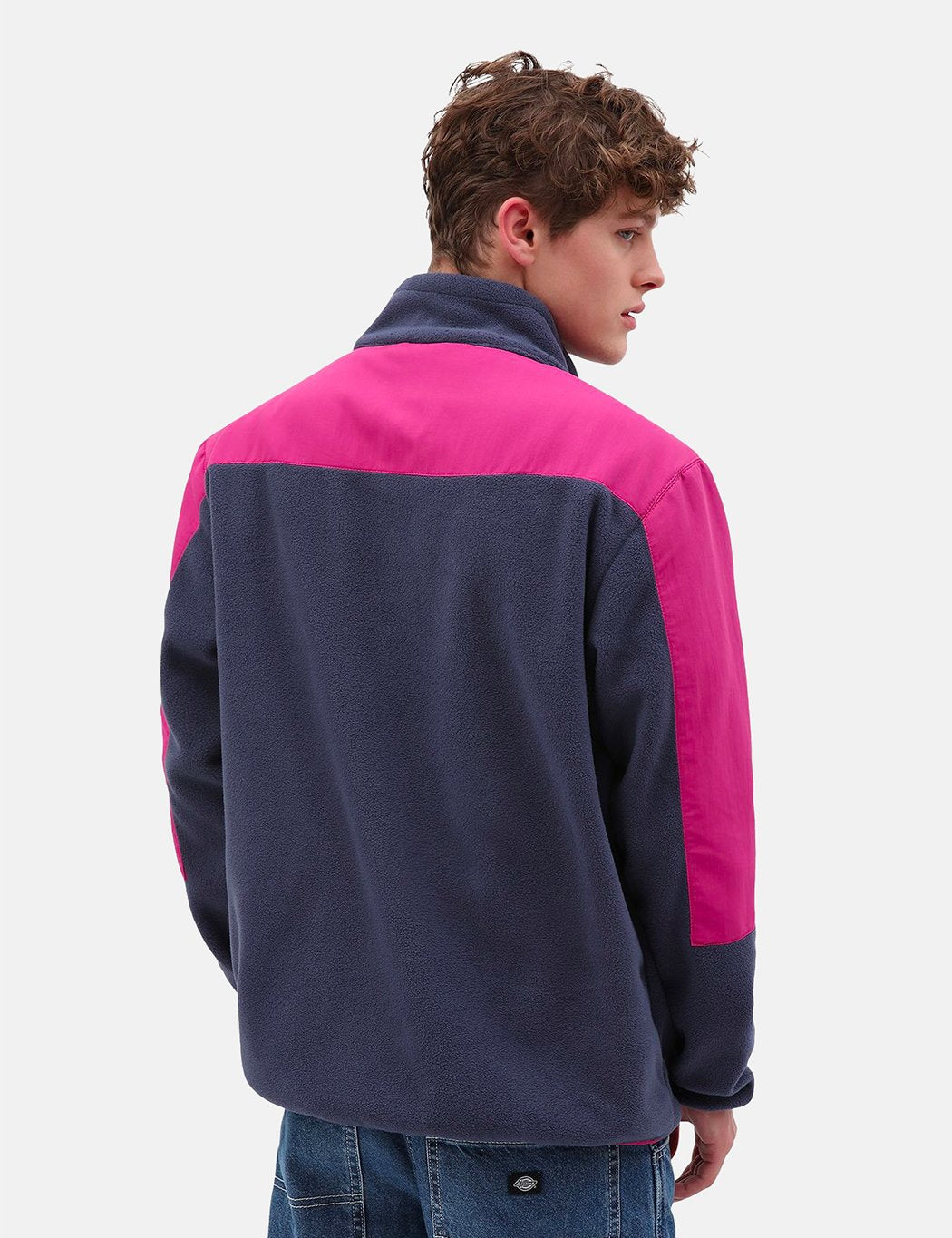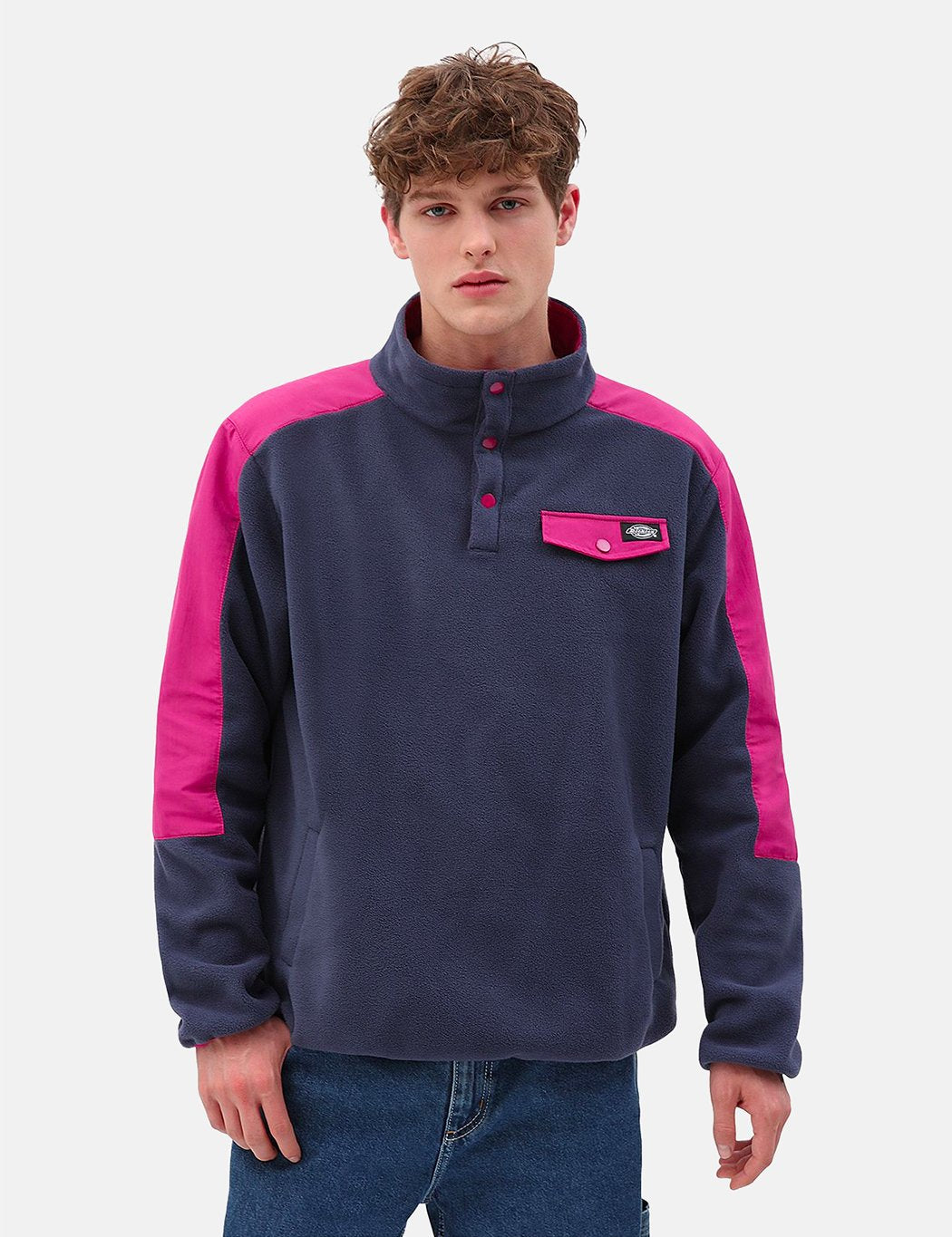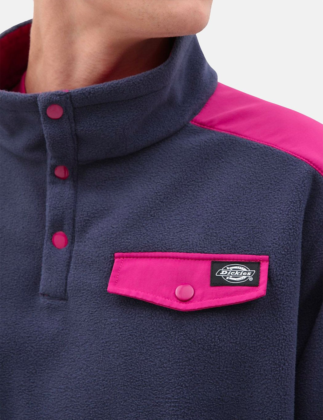A functional heavy pile fleece with patchwork pink colour on navy blue base, chest button down pocket, quarter neck pop buttons and dickies workwear branding.
