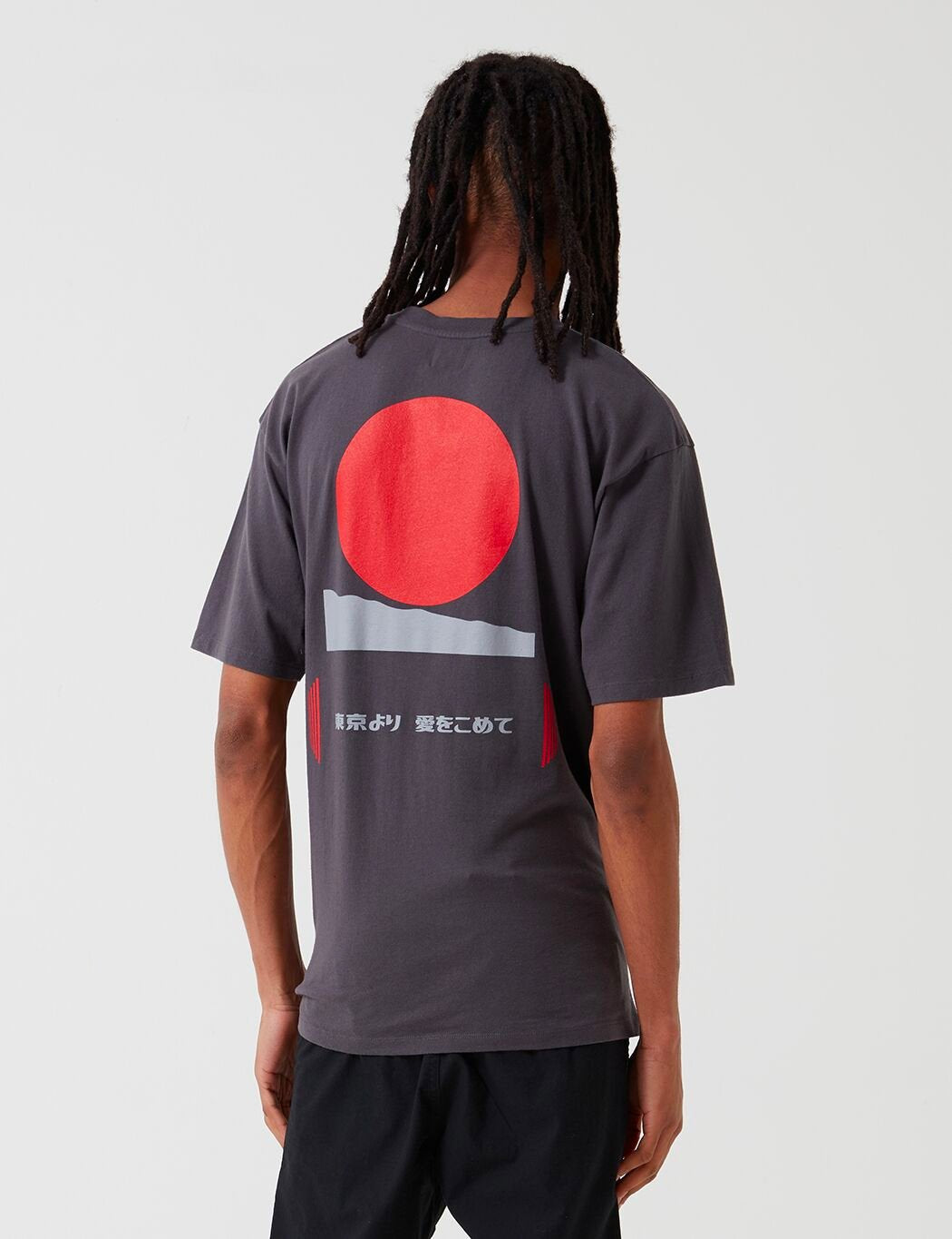 Garment washed Aurora Edwin graphic t-shirt featuring large Japanese sun artwork on the back and Japanese script on front centre. Made in Portugal.
