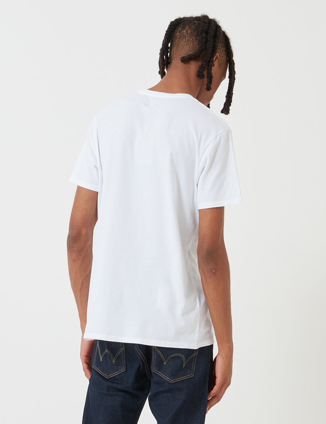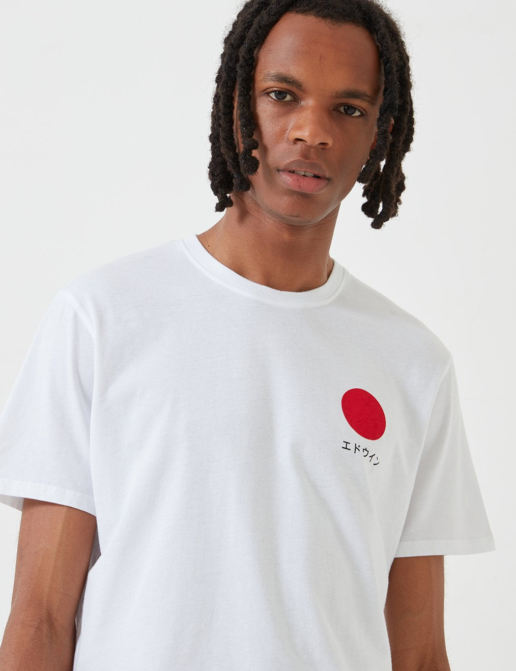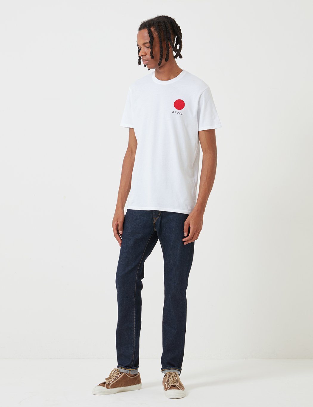 The Edwin Japanese Sun print tshirt in white garment washed cotton t-shirt featuring Red Japanese sun graphic above the Edwin sgnature.