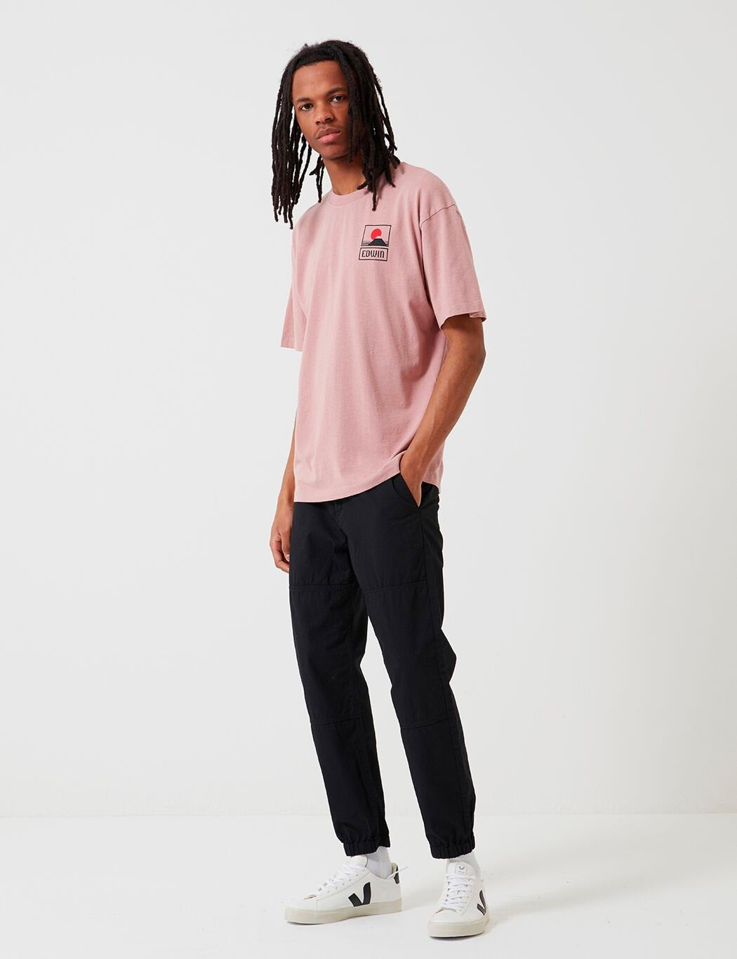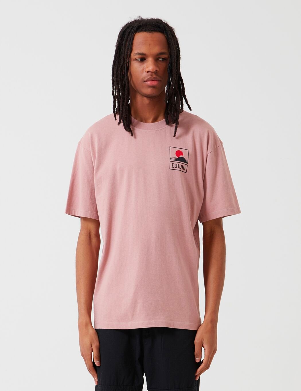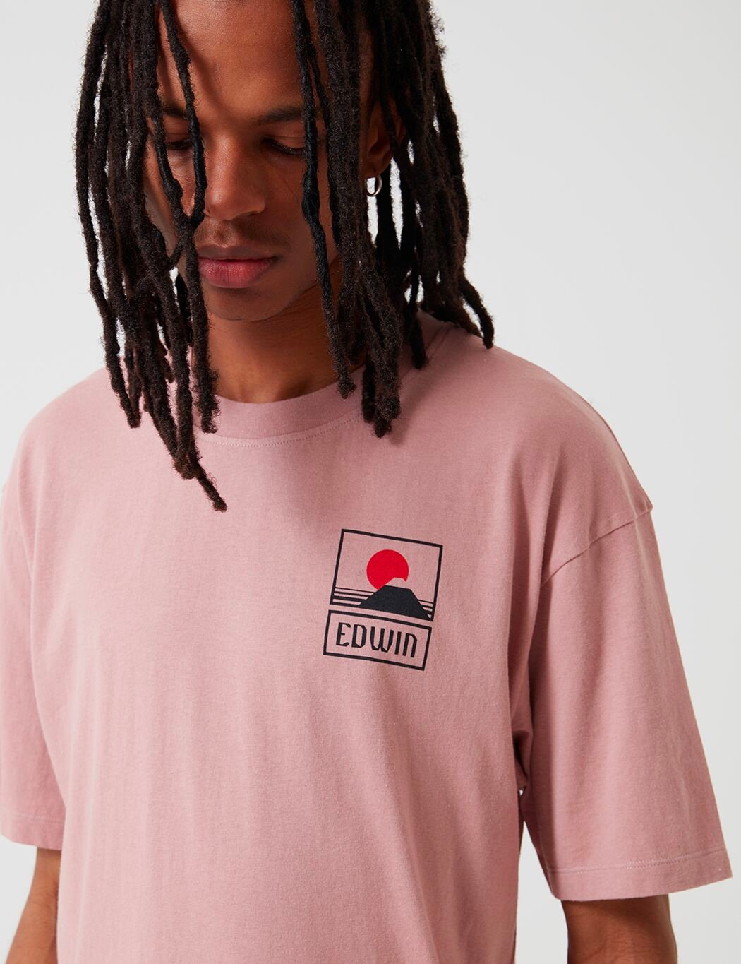 The Edwin Sunset On Mt. Fuji tshirt in woodrose pink garment washed cotton t-shirt from the Spring/Summer 2020 Edwin t-shirts collection.