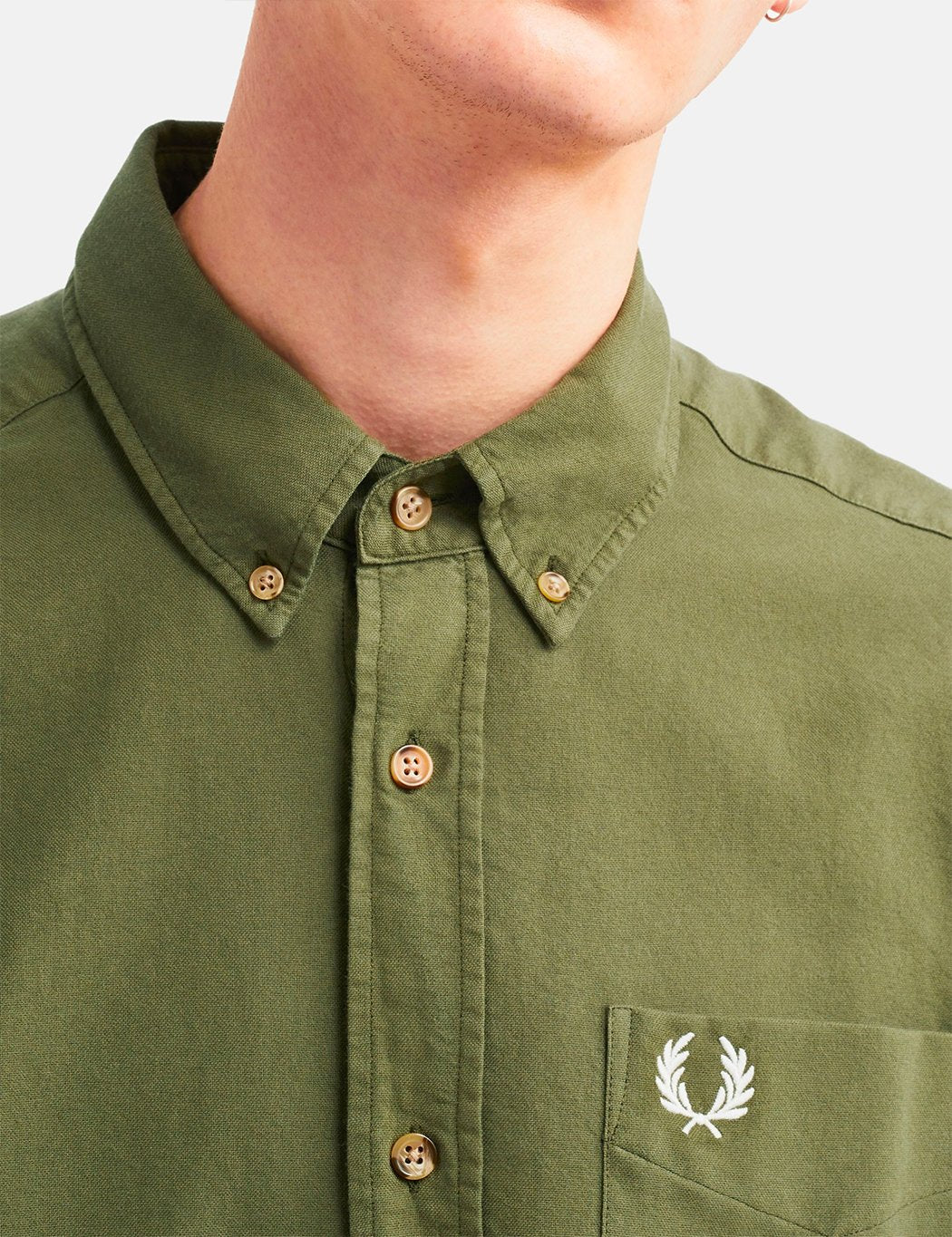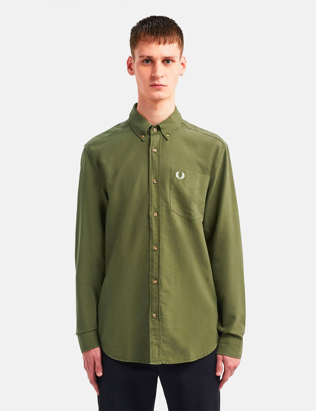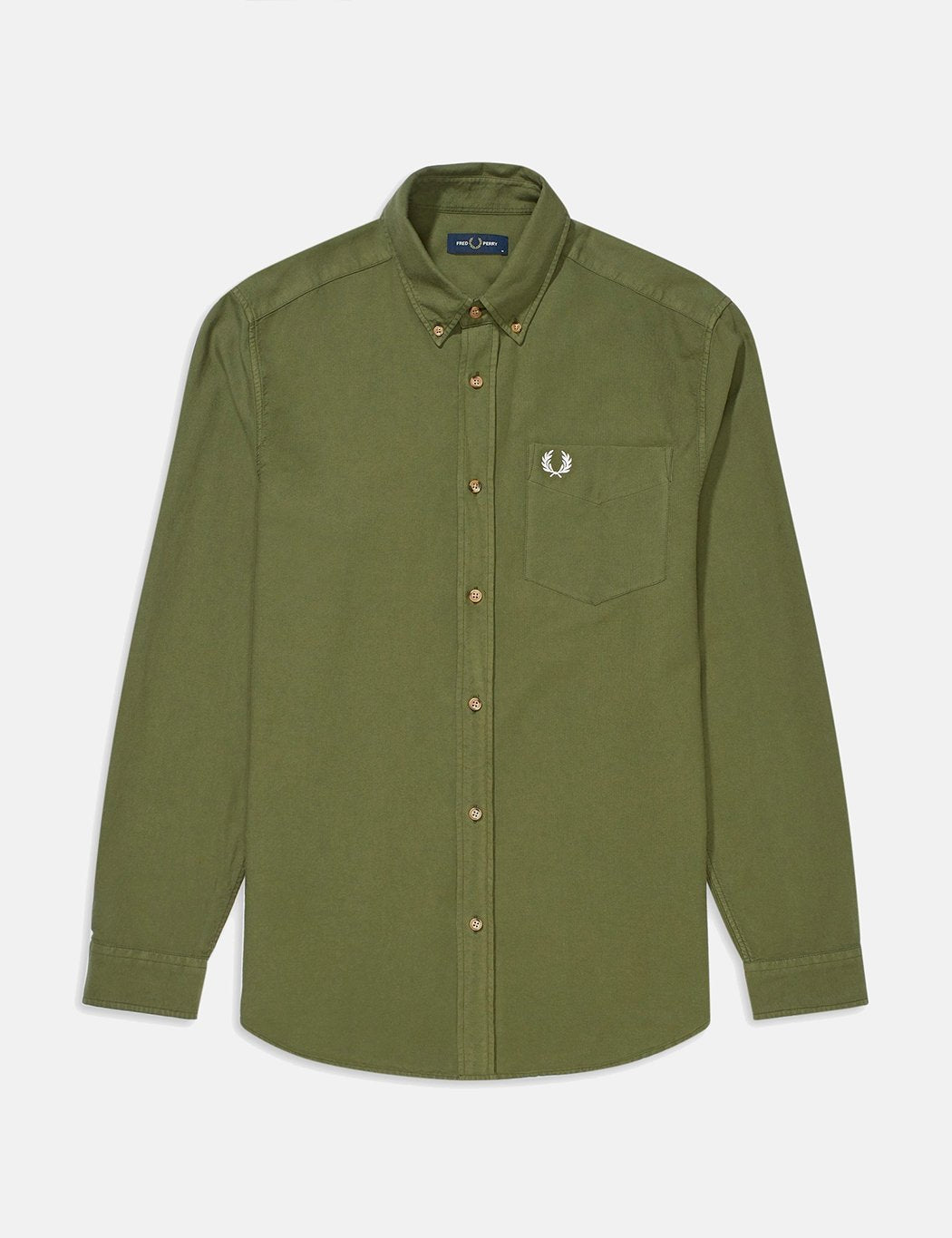 Classic button down oxford shirt in a soft military green overdyed cotton colour, featuring corozo button placket, and tonal Fred Perry laurel wreath branding on chest.