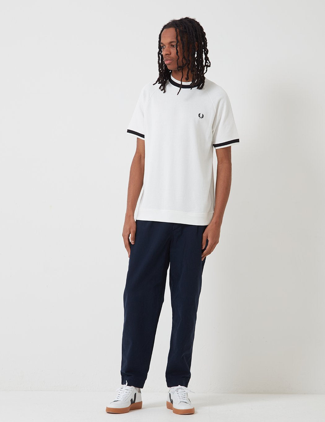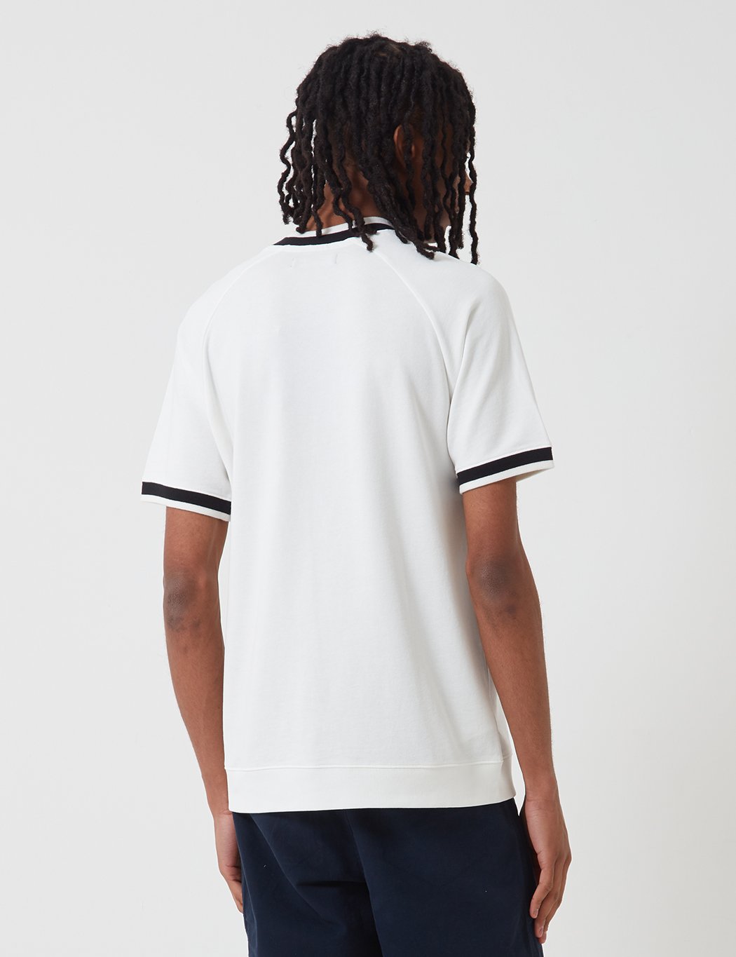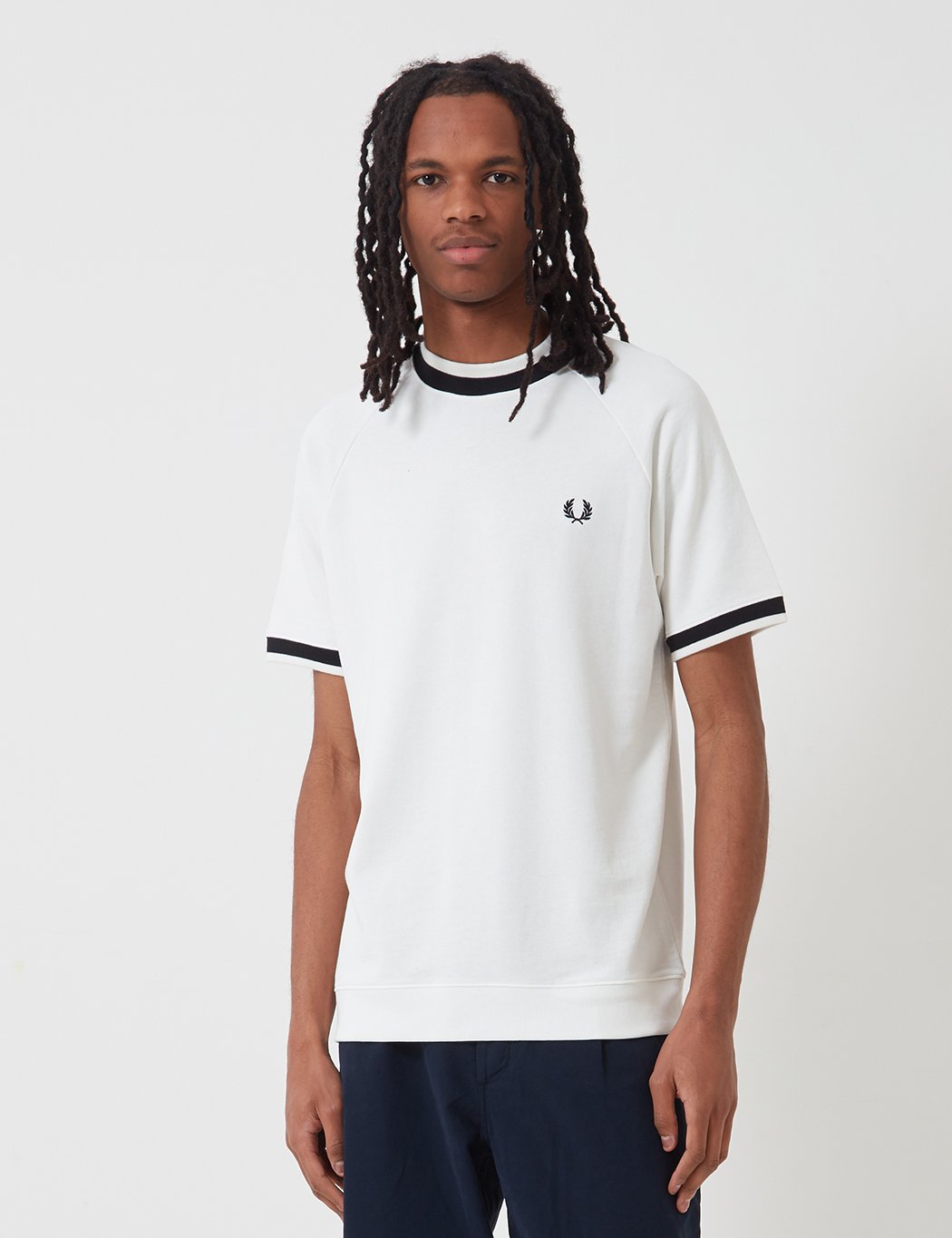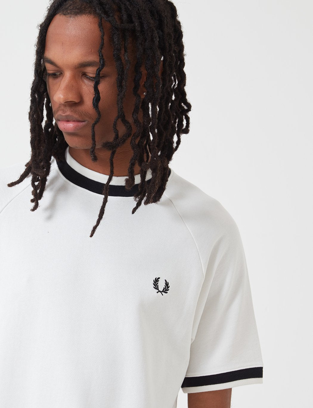 Short sleeve crewneck raglan tee with black collar and cuffs and Fred Perry logo on left chestProduct Details: