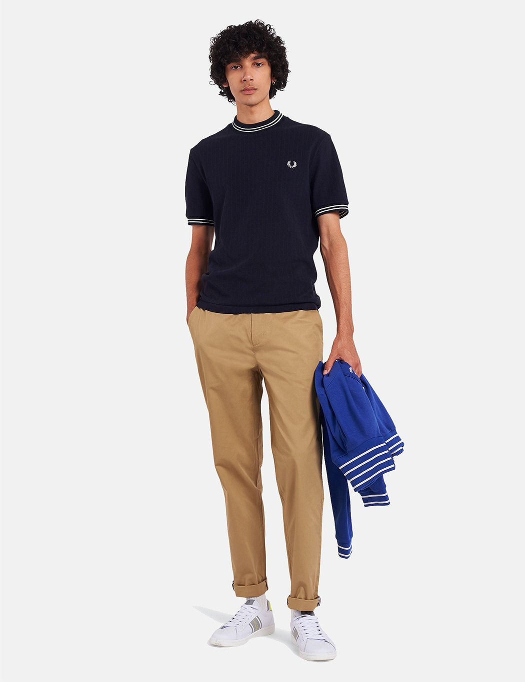 The Reissues crew-neck t-shirt references the Fred Perry shirt, made from the same combed cotton pique. It features M2 single tipping on the collar, with matching Laurel Wreath embroidery at the chest and knitted rib at the cuffs and hem.