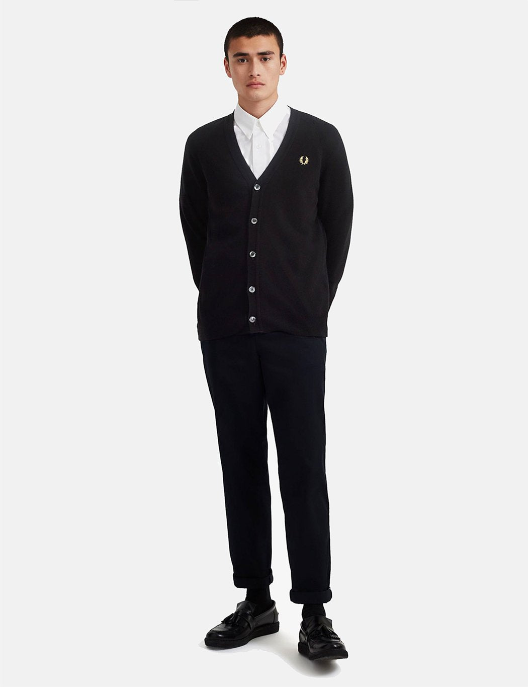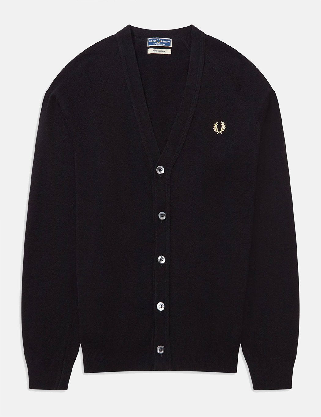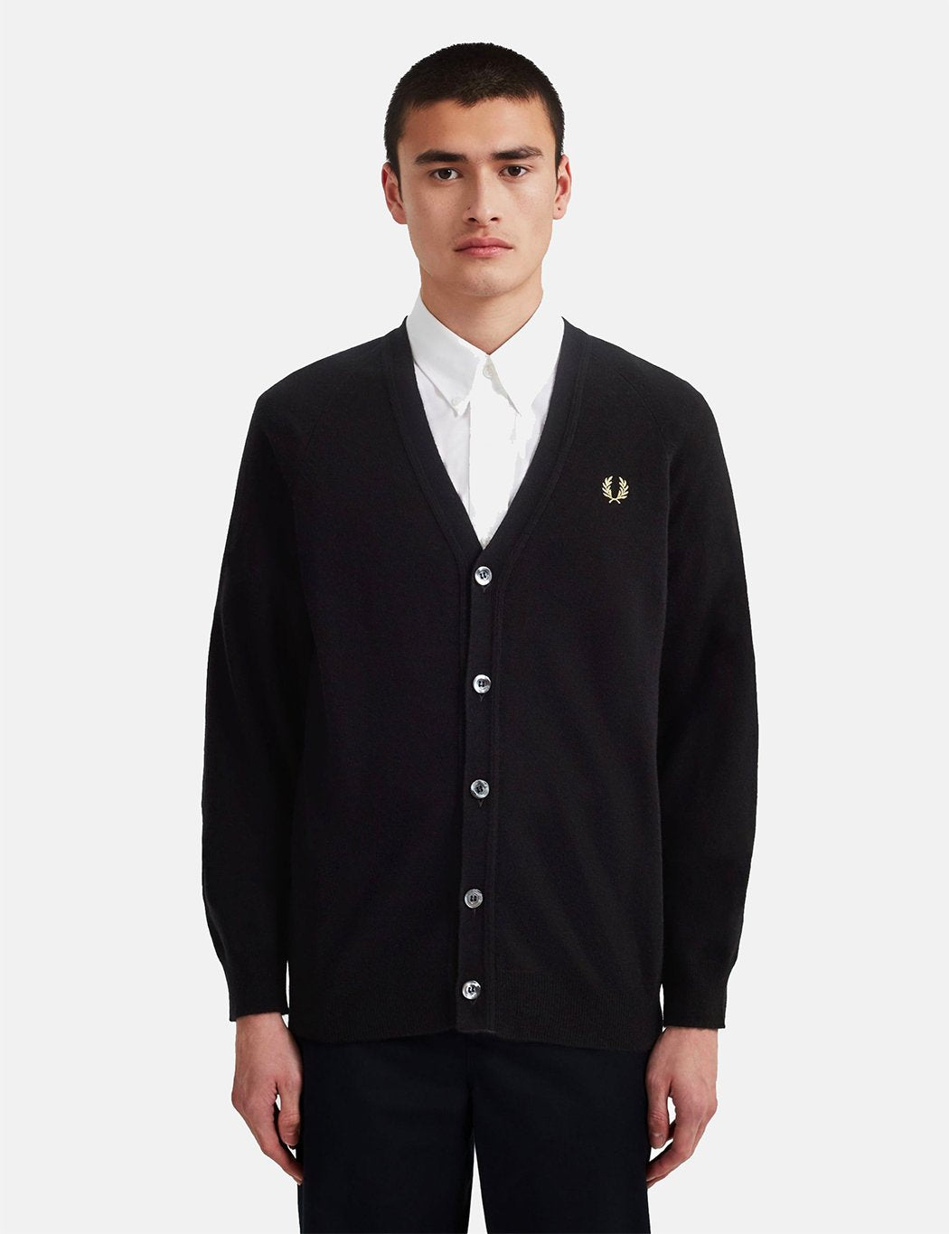 Classic British style cardigan reinvented in a Fred Perry lambswool fabrication in black with champagne laurel wreath branding.