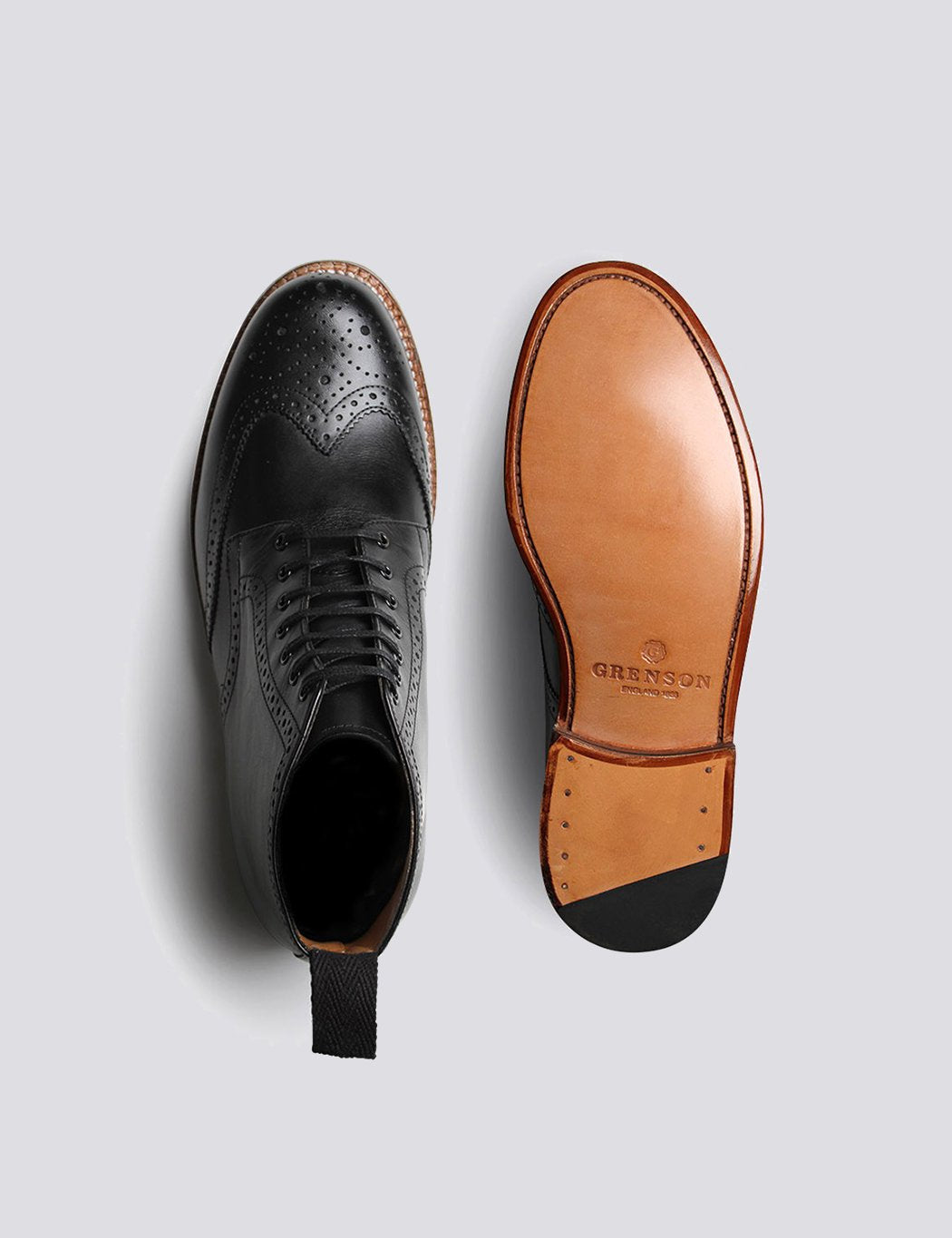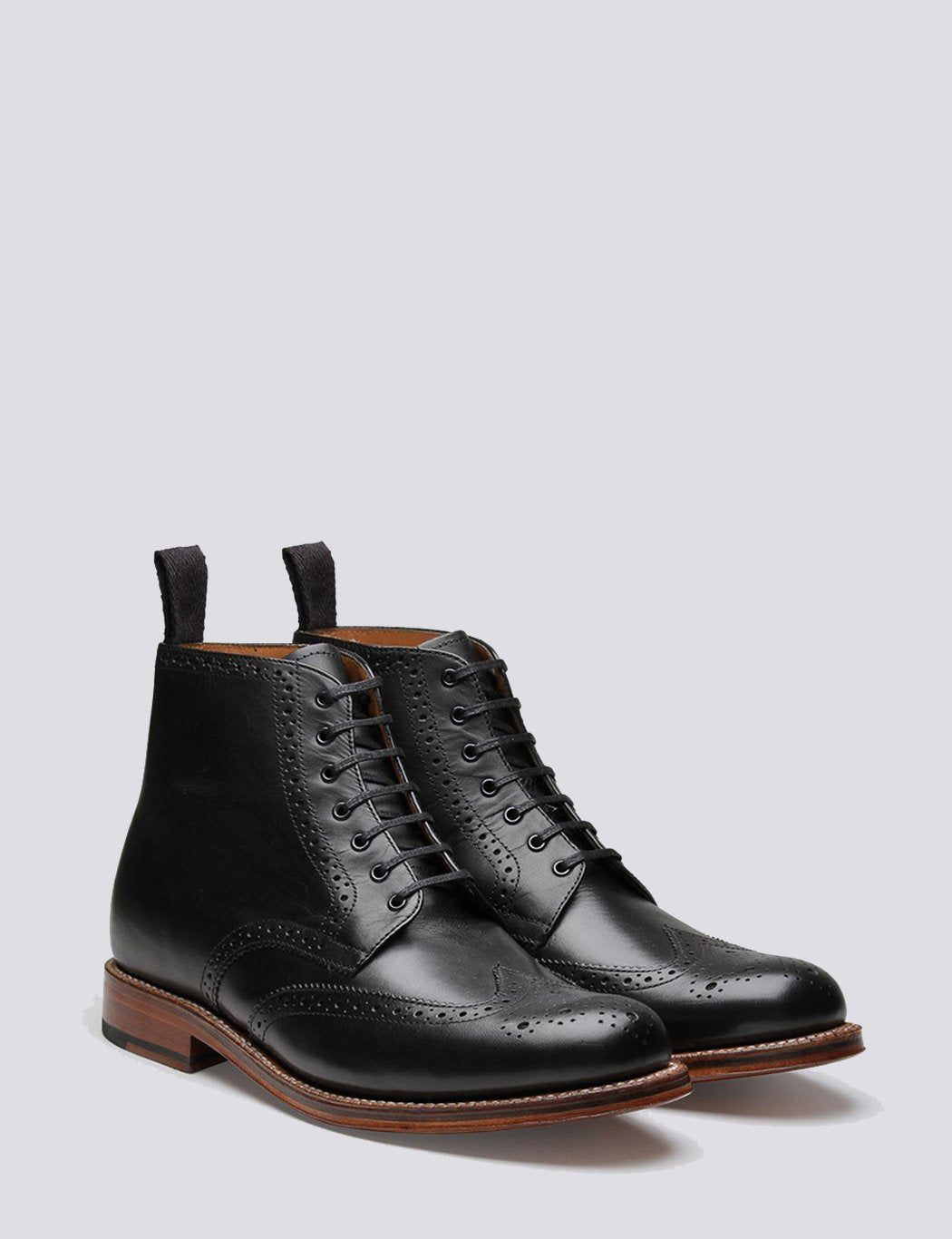 The Grenson Alfred calf brogue derby boot in Black with natural sole edge from the Grenson boots classic collection. The Grenson Alfred boots are constructed from soft calfs leather and come in a classic punch brogue design with Goodyear welted double leather sole.