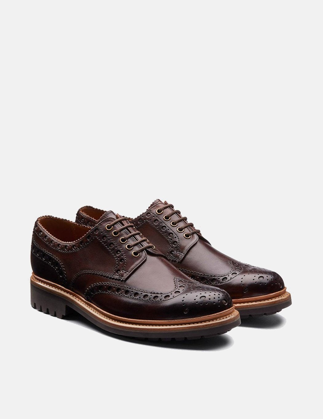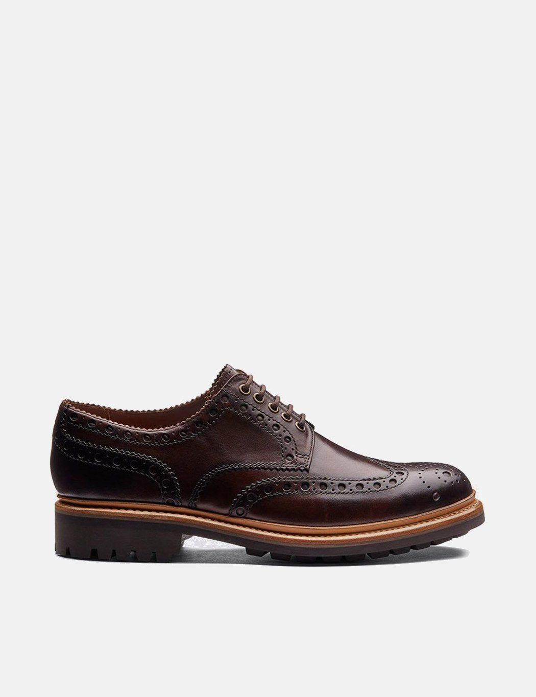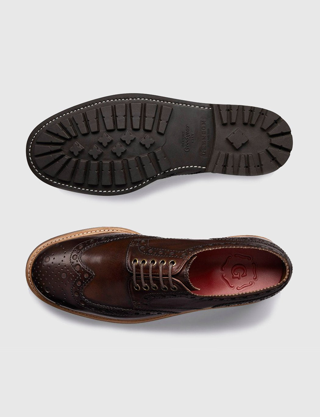 The Grenson Archie Gibson brogue in Dark Brown hand-painted leather from the Grenson Fall/Winter 2016 collection. This classic features oversized punch detailing and commando sole with a natural split welt.