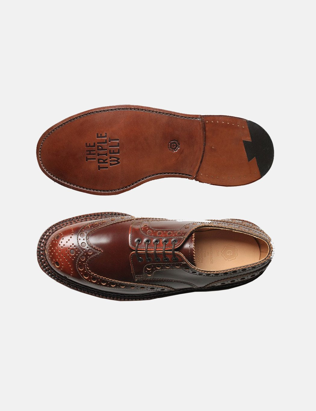 The Grenson Archie Triple Welt Brogues in Mahogany Brown from the Grenson Made in Northampton collection. The Archie Triple Welt is a full English Gibson brogue with exaggerated features. The Grenson Triple Welt was originally conceived by our craftsmen in the 'making room'. It features a unique stepped, triple style welt that makes the most of classic British Goodyear welted shoemaking. Made exclusively 'skin to box' in the famous Grenson factory, this is a true shoemakers shoe.