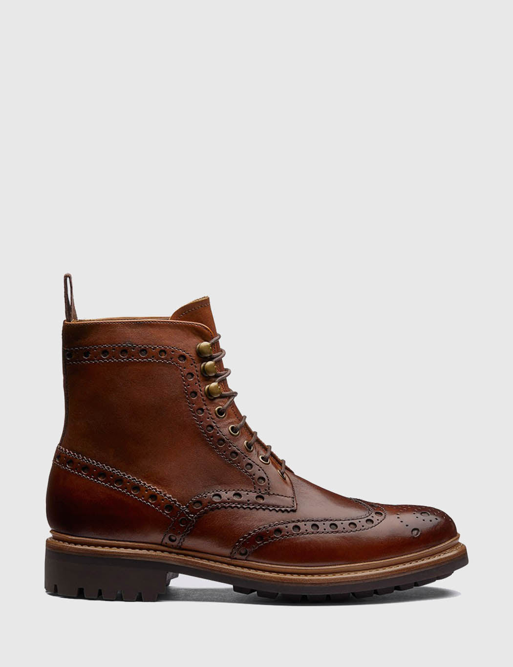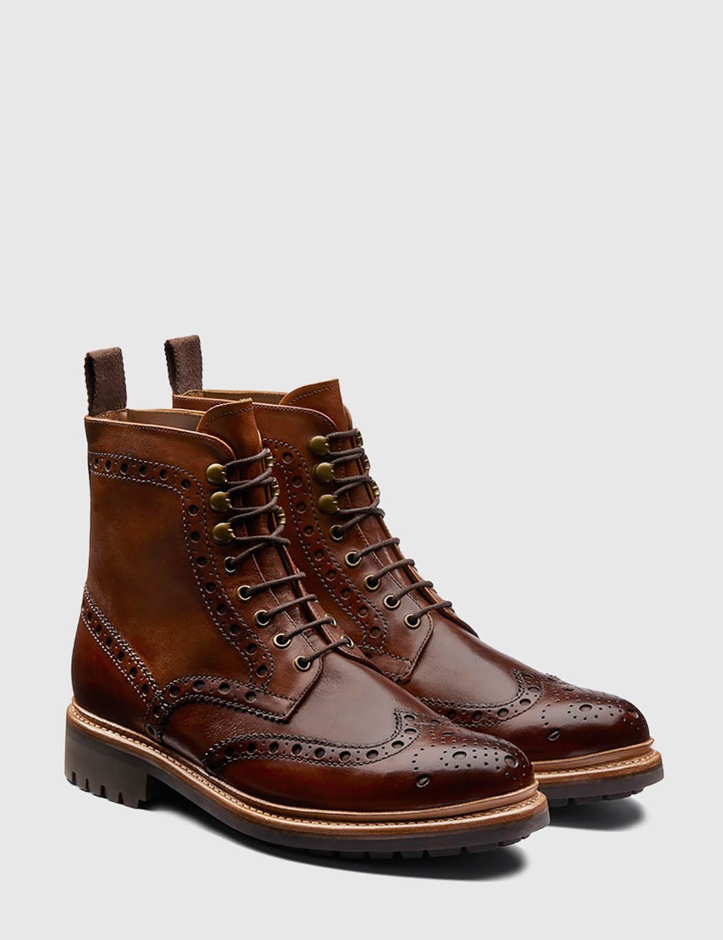 The Grenson Fred brogue boot in Tan from the Grenson boots Autumn/Winter 2019 collection. Please note: We recommended ordering a size down as Grenson shoes tend to come up large for their size. With a durable commando sole, signature oversized punching and big eyelets, Grenson Fred is the boot version of Archie.