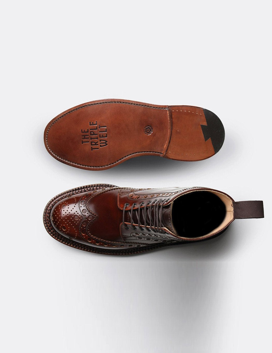 The Grenson Fred Triple Welt Boot in Mahogany Brown from the Grenson Made in Northampton Spring/Summer 2015 Collection.. The Grenson Triple Welt was originally conceived by our craftsmen in the 'making room'. It features a unique stepped, triple style welt that makes the most of classic British Goodyear welted shoemaking. Made exclusively 'skin to box' in the famous Grenson factory, this is a true shoemakers shoe.