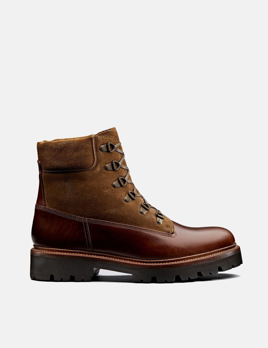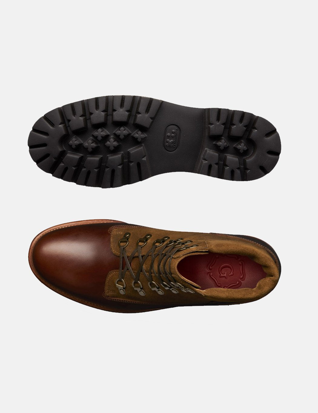 Rutherford is a simple Balmoral style derby hiker boot with a padded collar, feature lacing and a lightweight commando sole. This multi toned chestnut pull up leather is tanned with lots of natural oils and waxes which darkens it. When you stretch or pull this leather, it lightens as the wax disburses which also means it marks quite easily. This is very much part of the look of this leather as it is a very natural product and we believe makes your shoes age both beautifully and naturally.
