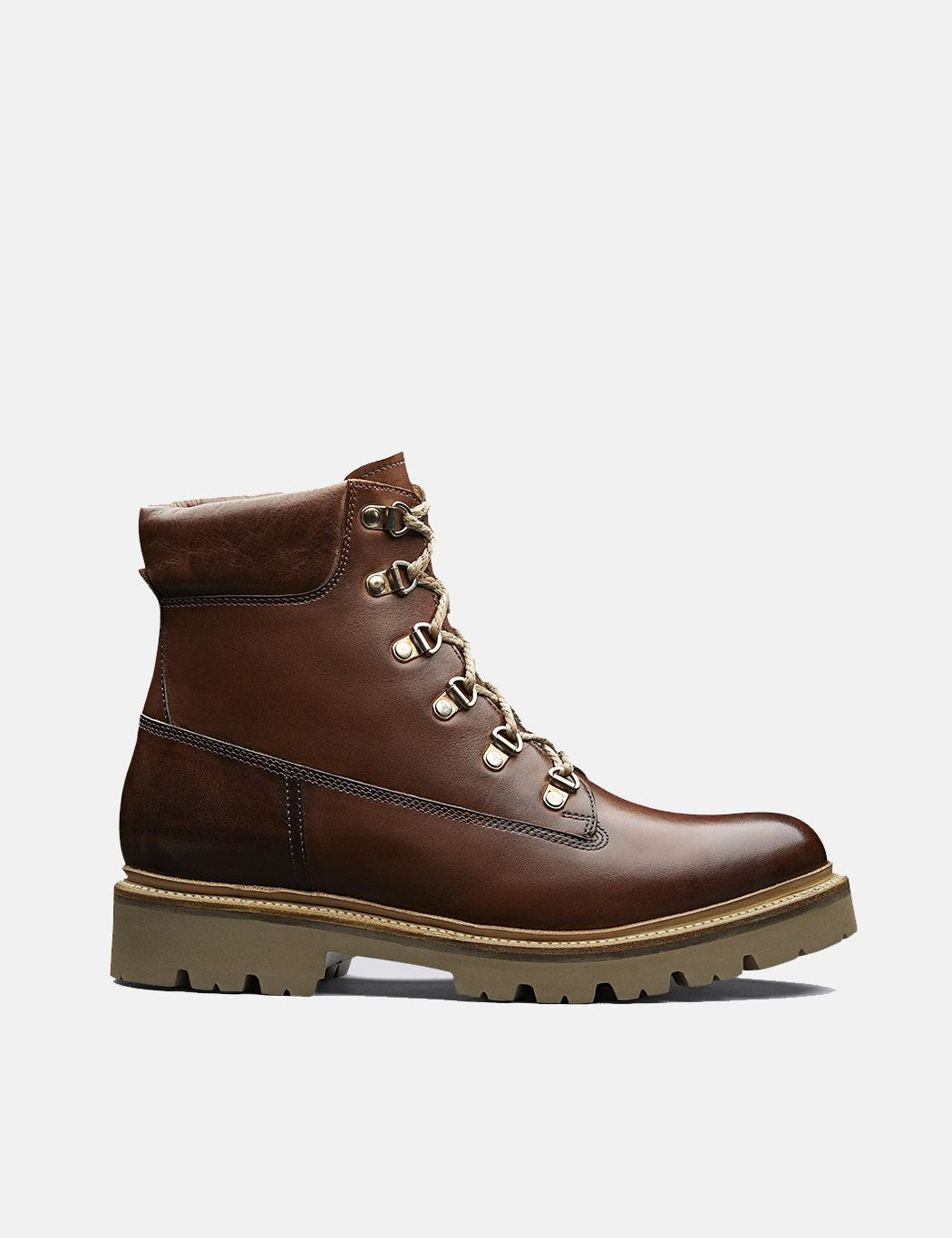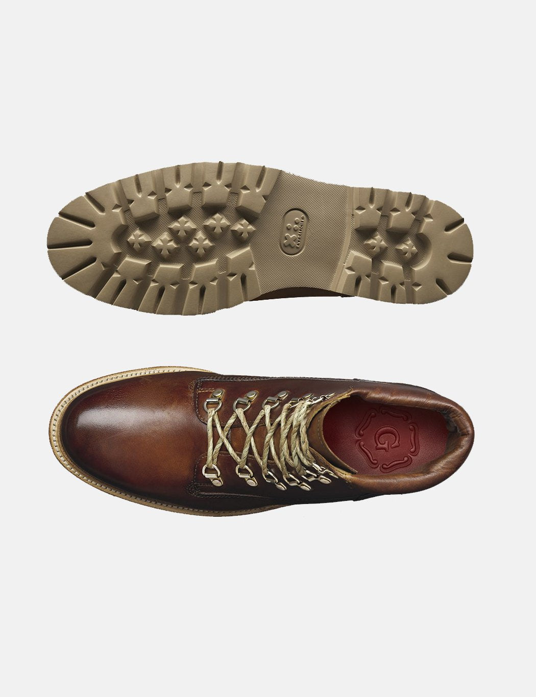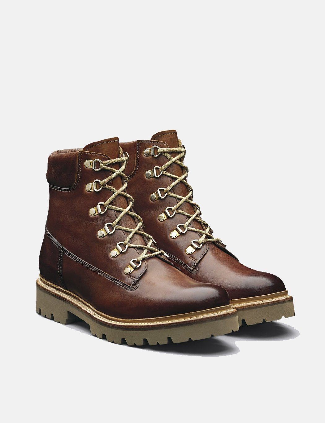 Rutherford is a new Balmoral style derby hiker boot for the Spring/Summer 2019 season. He features a padded collar for comfort and natural tri-toned beige cross over lacing. Here he is in our richly toned tan handpainted leather with our rugged but lightweight Richfield Commando sole for grip and performance.