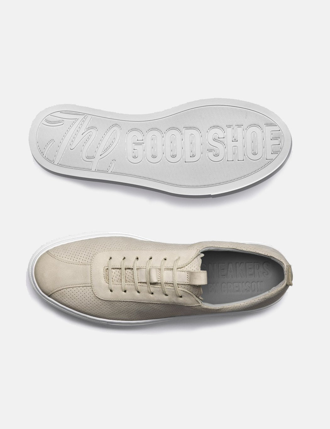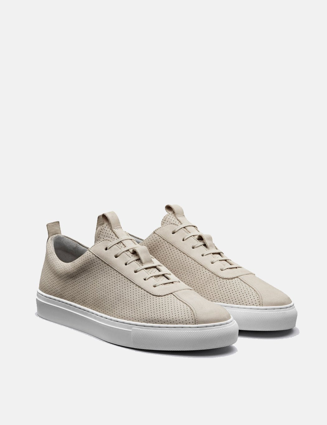 Sneaker 1, based on a super clean 70's tennis shoe and made from off white Italian nubuck with a small "pepperpot" perforation detail in the leather. These are finished with an Italian white rubber cupsole branded with our Good Shoe logo.