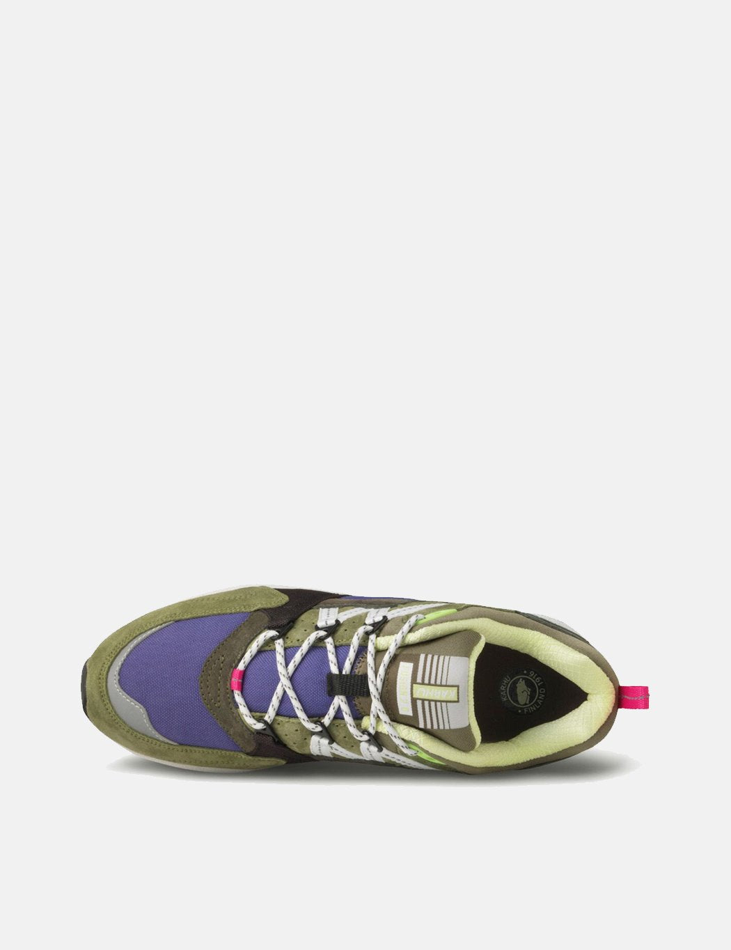 The Karhu Fusion 2.0 in forest night and bright white blue and yellow accent tones on upper unit, tongue and inner lining. Featuring a full pigskin suede upper, signature Karhu rope laces and metal lace loops.