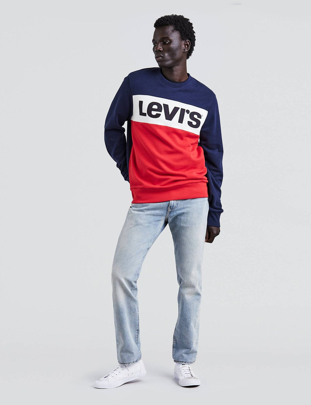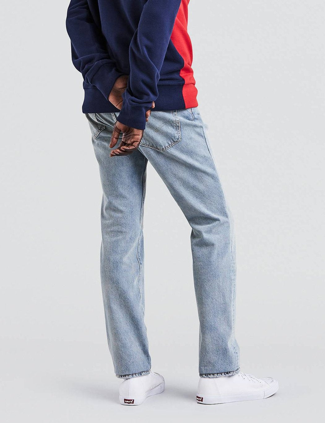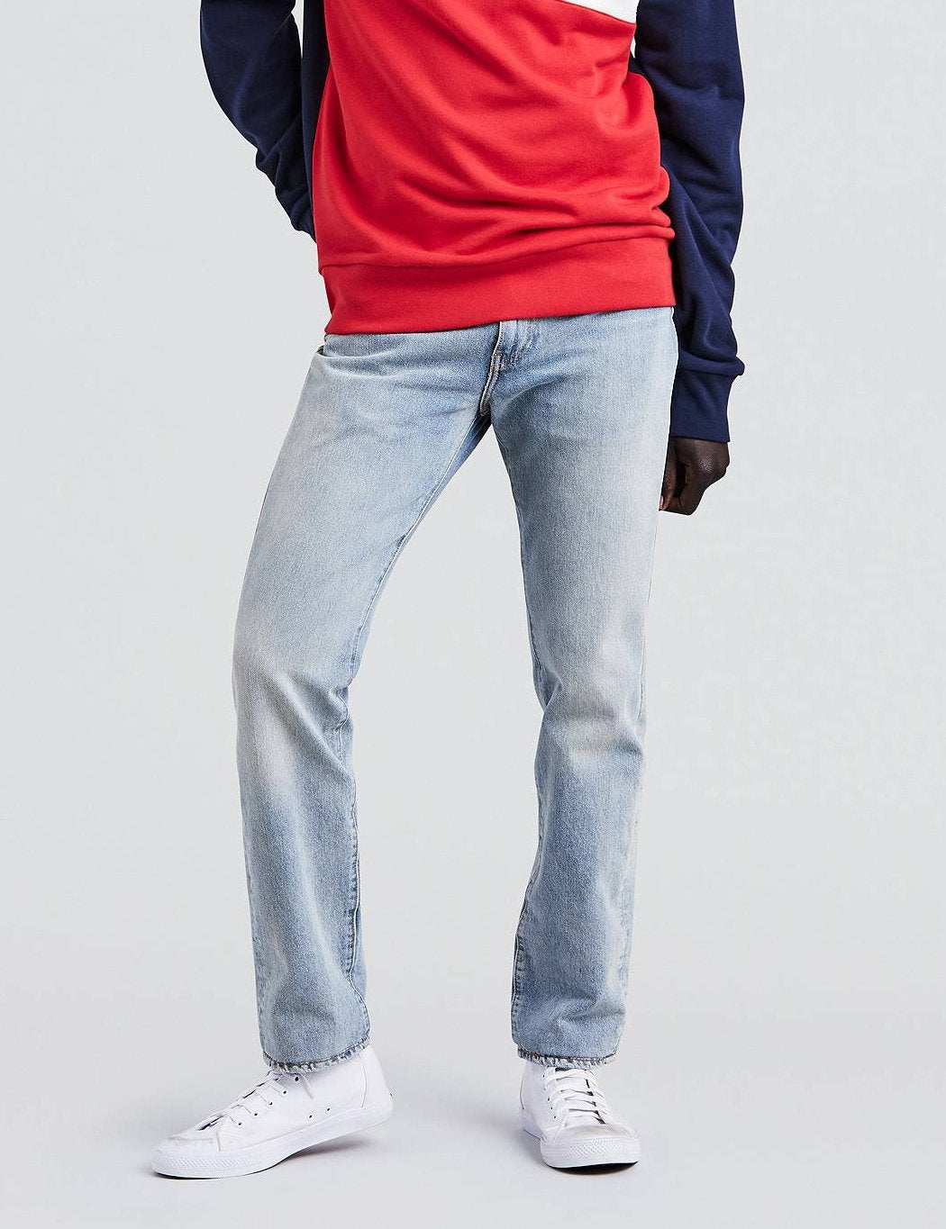 The 511 sits below the waist with a slim fit through the hip and thigh and a slim leg. They feature the classic details and a black leather patch on back.