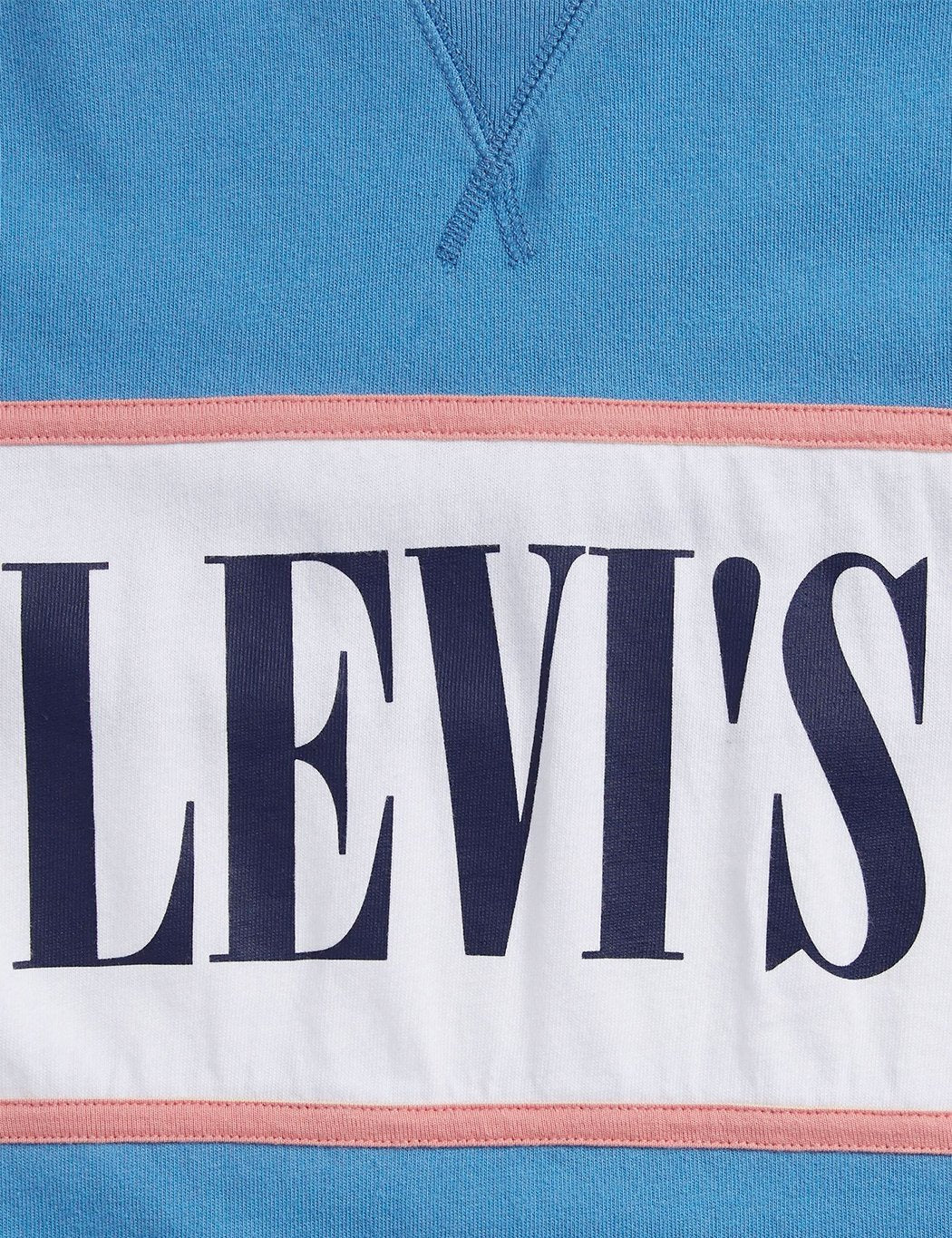 A medium weight short sleeve Levis logo t-shirt featuring colour block retro design with Levis script and sports stripes. Made in a relaxed fit.